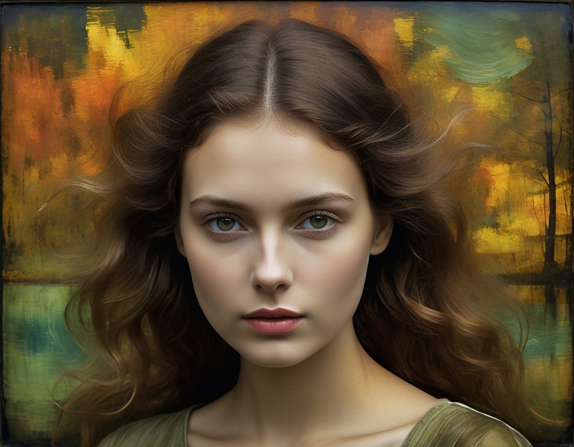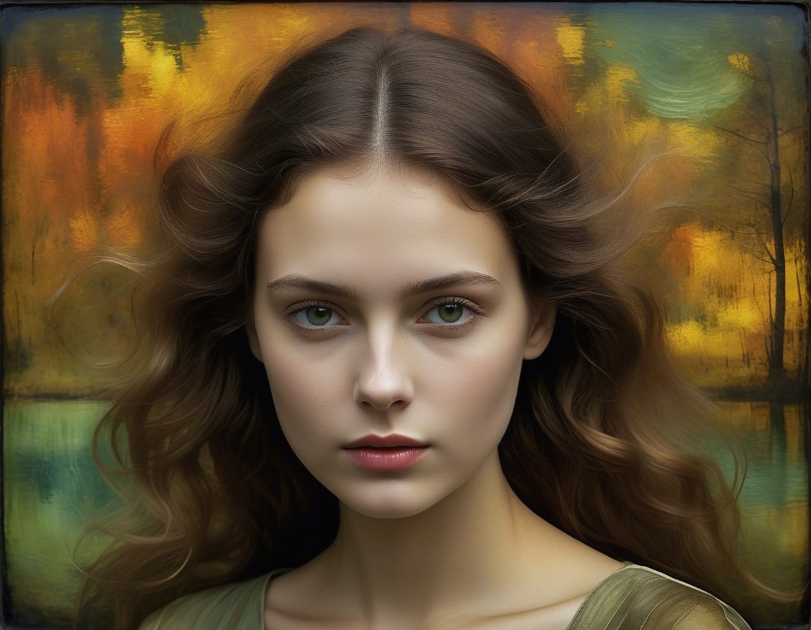 A serene portrait of a young woman with flowing hair, set against a softly blurred autumnal background of warm colors. Her expressive eyes reflect tranquility and depth.