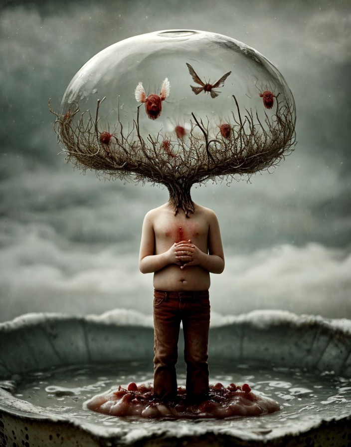 Prompt: "The bloody soap bubble is full of miserable creatures -- but one cute one of them doesn't belong there, by Jon MacNair in style of Gross_horror_terroR_L0Wbr0W billow_wave_clouds-Simulation pattern by artist Michael Hussar infused with art from from Flora Borsi_The Codex Seraphinianus :: A red albino viscerocranium death human face bones fused with spider face and with a face of bio-surreal horror SCORN_GAME art (anthropomorphic_amoeba_femme_fatale)_fleshy biomechanical, with white and black heterochromia blind eyes, thick spine like tentacle hair, near anthropomorphic! near photorealistic!, nymphaea!, Electron photography, RAY TRACING, 3 point lighting, best ambient occlusion settings, SCORN Femme fatale, by Trevor Brown inspired by nicoletta ceccoli"
