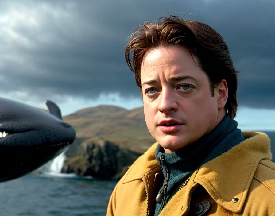Clown makeup person with red nose and fuzzy mask against stormy sky