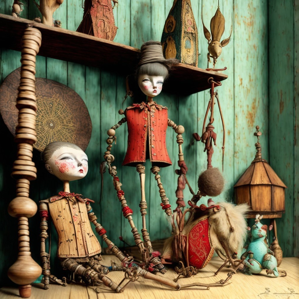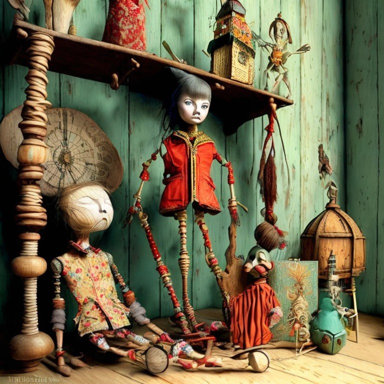 Whimsical Dolls in Vintage Room with Spinning Wheel