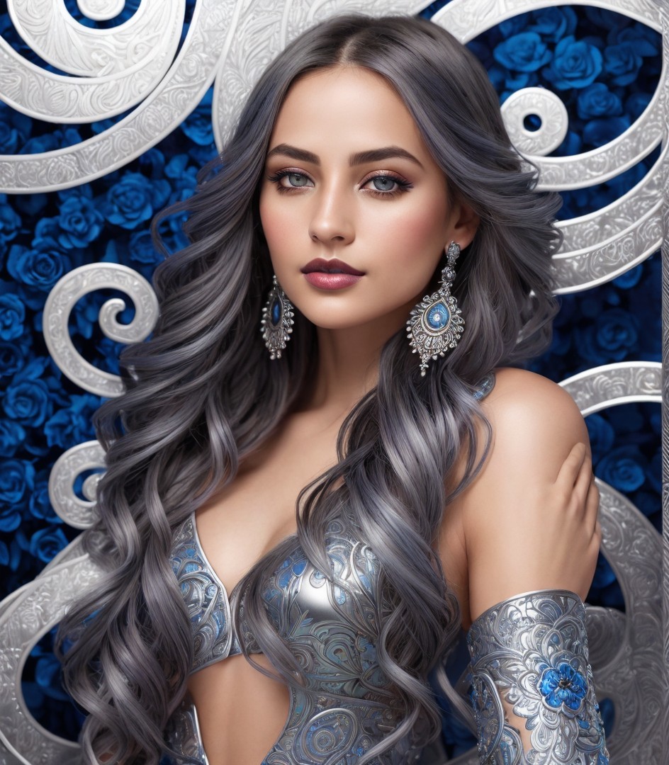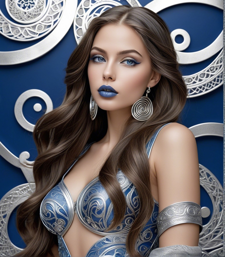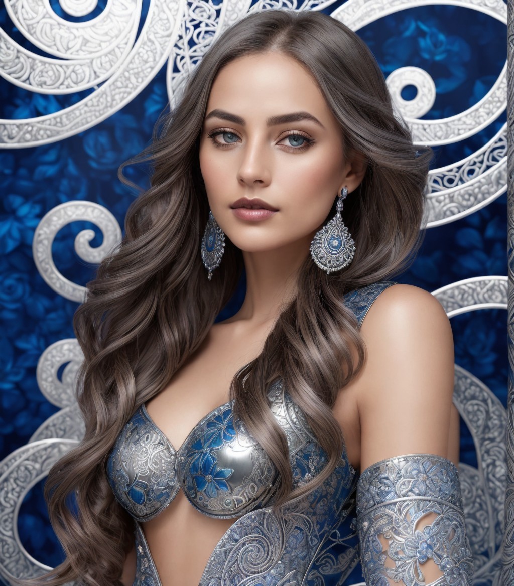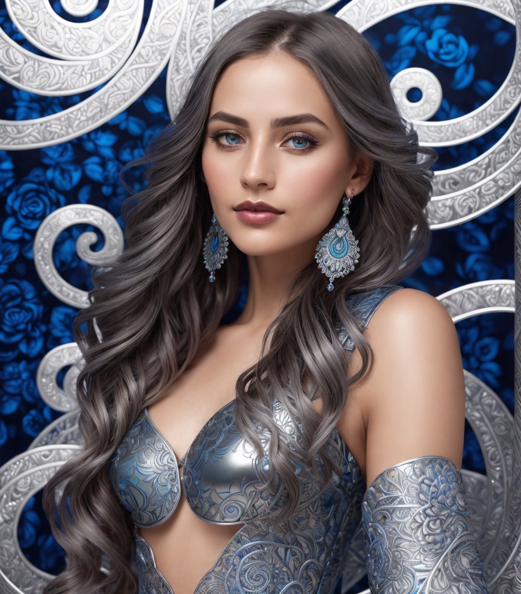 Digital Art portrait. Smooth metallic texture with silver and deep blue hues, intricate silver engravings, spirals, floral designs, almond-shaped eyes, subtly colored lips, --ar 1:1 --q 2 --s 750, brightened color palette, multi-layered eyes, headshot, intricate indiecore details, tetradic color scheme baby-blue dark-blue silver-blue light-blue, smooth 3 point lighting, consistent dappled lighting, tesselated, stippled, blotted, Vfx-inspired, abstract influences, color hues by Overton Loyd and Ho baron and Stan Lee's luminism, stylized hairdo, soft edges, stylized design hand-drawn, intricate zentangle patterns in background, plasticity 1.3, bioluminiscent, multi-layered eyes, mix of ink and oil, detailed line work, resin coating, styled by John Buscema, movie still, subsurface scattering 1.3, vintage aesthetic, warm tones, coarse texture, complex lighting setup, brightness 1.3, highlighted, reflections squiggly line art, LiDAR point cloud integration, intricate and complex features, oil and wax mediums used, creative and artistic approach, overall composition by Ho Baron and Lyonel Feininger. Folk-art remniscence, tribal, zentangle, 3d effects, dynamic lighting, quaint, serene, fine micro-pen linework, reminiscent of Susan Seddon Boulet's rewildered essence, orphism influence, textured skin, complexion 1.3, dof, bokeh, debeh, gothical fantasy, urban steampunk, intricate chin, lean nose, detailed multi-layered eyes, rounded edges, approach, watercolor overspray technique, extreme variety of colors, textured skin akin to William Bradley's artistry, slightly sculpted, flowing hair illusion, ethereal atmosphere, layers of fabric, asymmetncal, jewel-toned color explosion, stylized in style of Yinka Shonibare, (background: ((psychedelic, (triadic color scheme of grey, dark-blue, and silver) 8:11, gelsculpt 64k), precision, overlaid texture on roughly woven canvas, novelty architecture) 8:17)