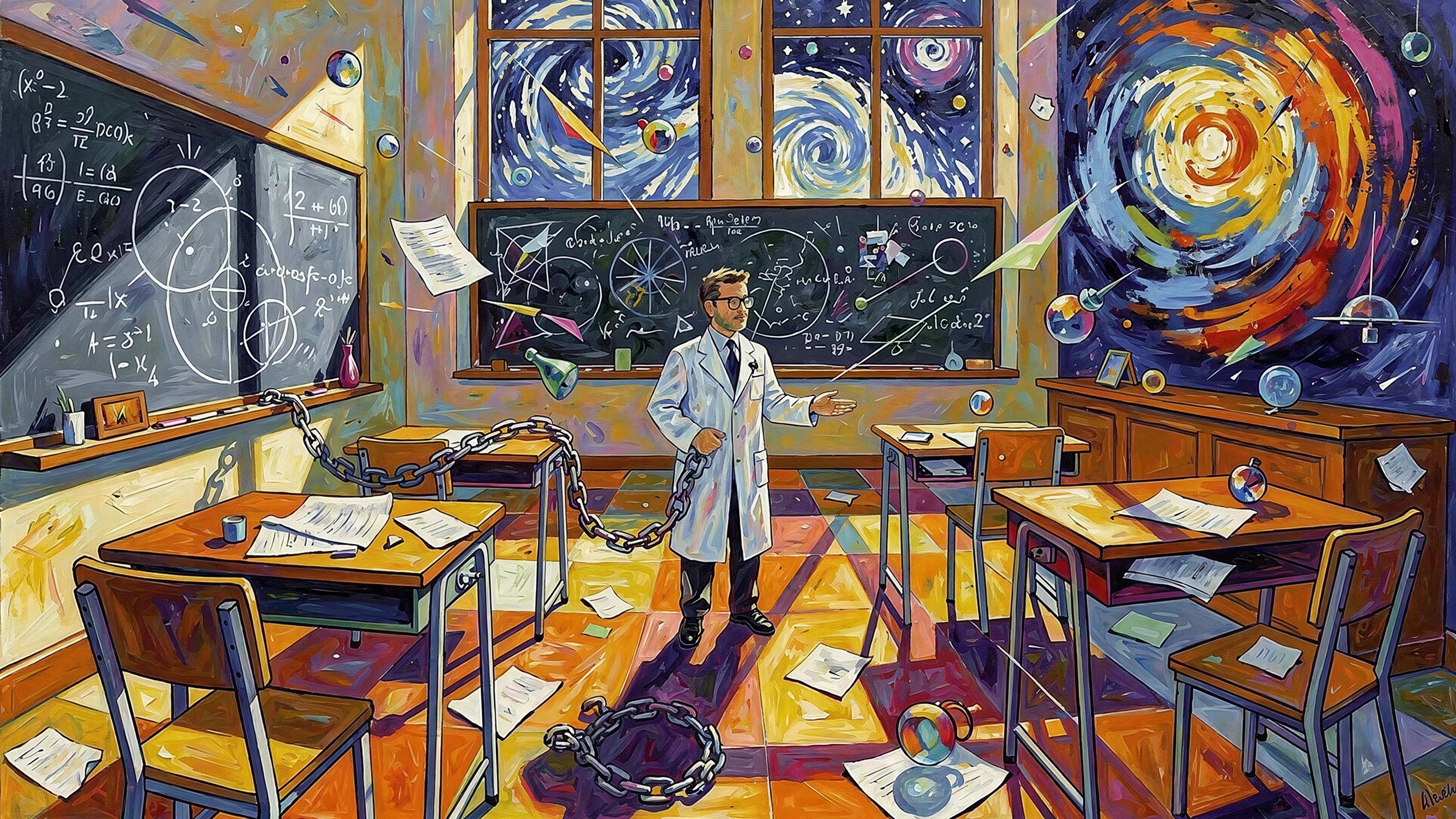 A vibrant cubist masterpiece depicts a whimsical scientist in chains within a classroom, showcasing visible brushstrokes and a polar vortex backdrop. The elegant, colorful scene captivates with its vivid detail.