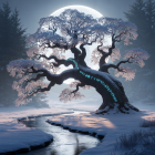 A magnificent tree stands alone by a snowy river under a bright full moon, surrounded by frosted landscapes and a starlit sky, creating a serene and mystical winter scene.
