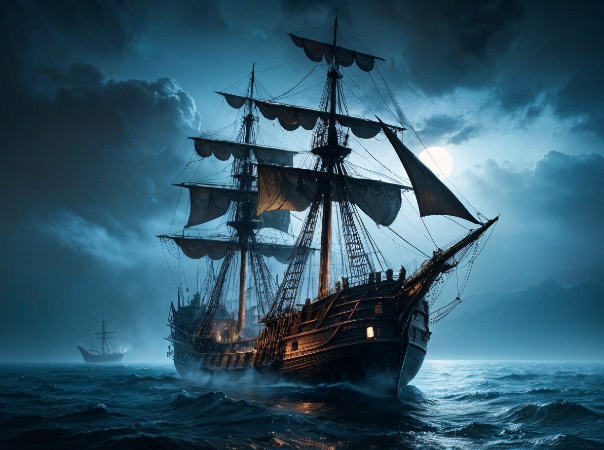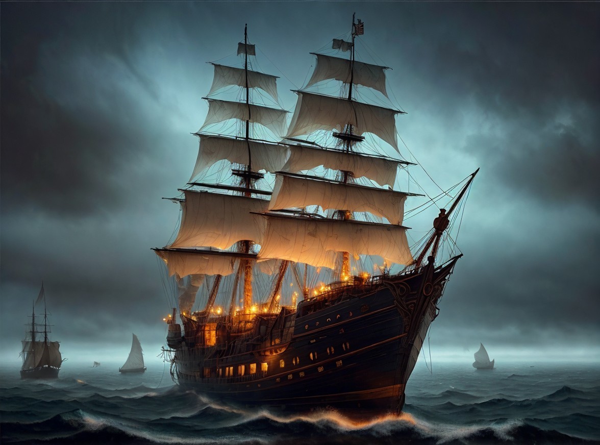 A majestic ship sails through a stormy sea, illuminated by warm, glowing lights against a dark, moody sky. The scene conveys a sense of adventure and mystery, with another silhouette in the distance.