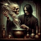 A mysterious figure with long dark hair brews potions in a dimly lit chamber, surrounded by candles and ancient artifacts. Flames flicker as he stirs a bubbling cauldron, exuding an enigmatic aura.