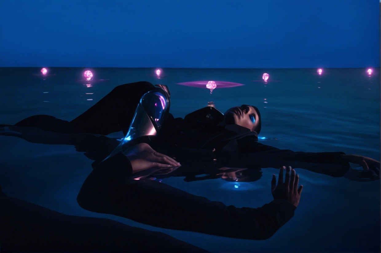 A figure floats serenely on still water, surrounded by glowing pink orbs. The dark surroundings contrast with vibrant accents, creating an ethereal, dreamlike atmosphere.