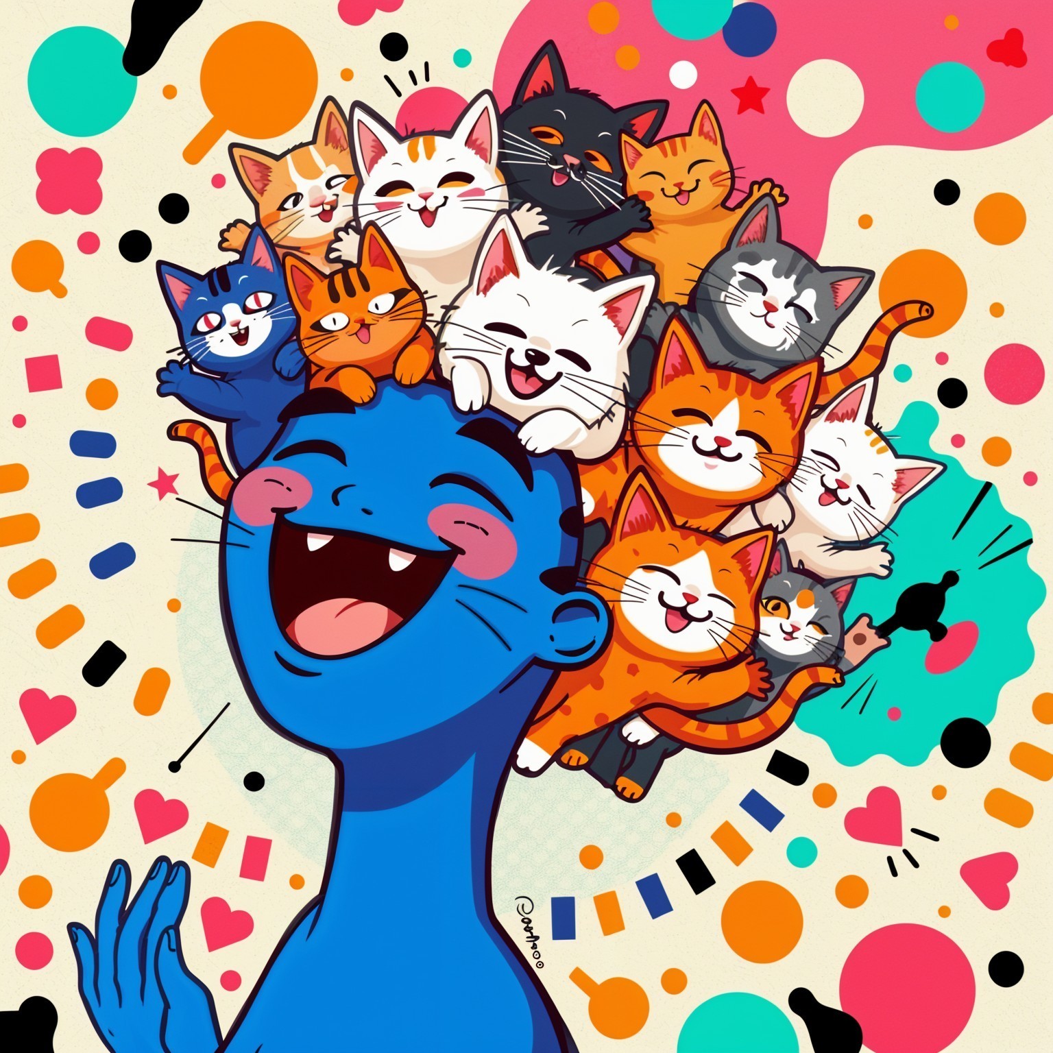 A cheerful blue-skinned character beams with joy, surrounded by a playful group of colorful cats, all set against a vibrant, pastel-colored background filled with hearts and swirls.