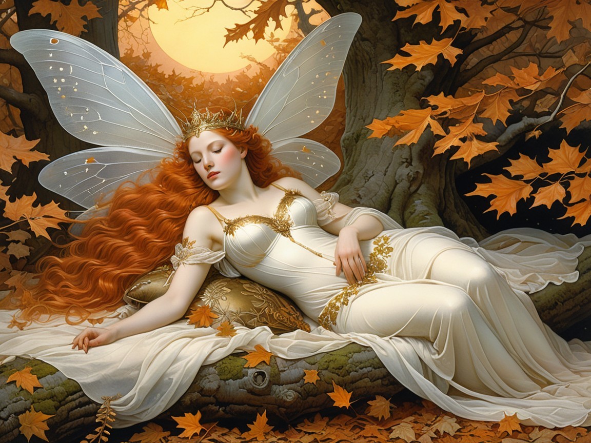 A fairy with long flowing red hair and a golden crown sleeps peacefully on a tree trunk, adorned with delicate white wings and a pearl-like sheen. She wears an off-white dress with gold ornamentation. The background features a warm autumn forest with orange and yellow leaves, and a large golden moon casts