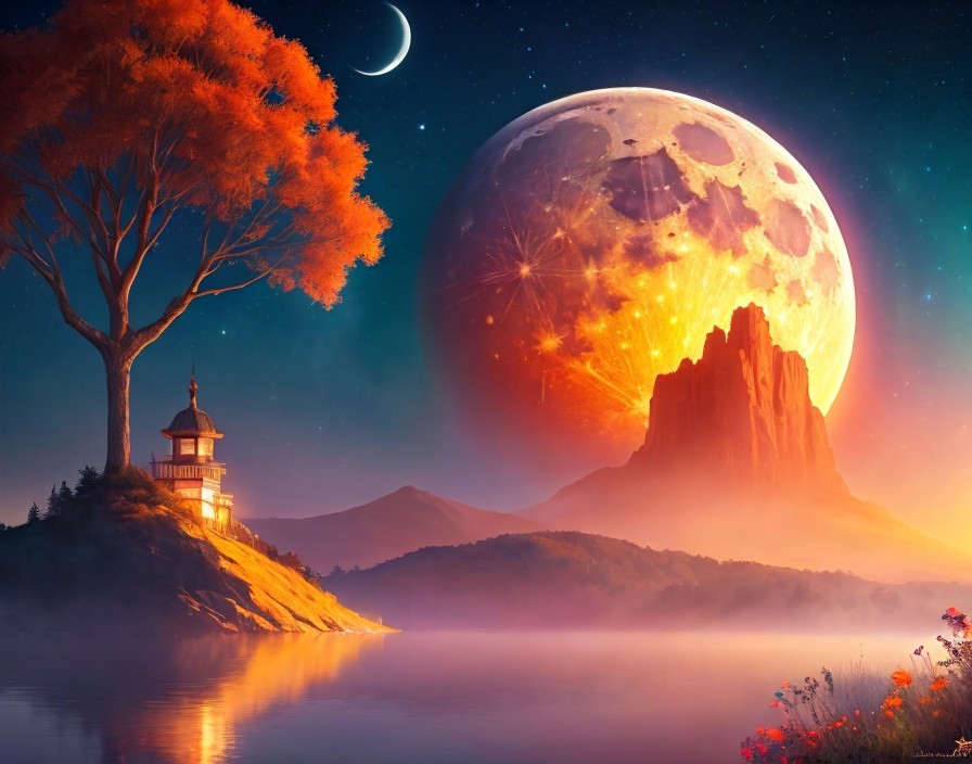 Prompt: captivating digital watercolor illustration featuring an orange full moon and a bright star in a summer landscape. Ensure the artwork is a meticulously detailed matte painting, boasting deep, vibrant colors and intricate details. Incorporate elements of splash screen design and utilize complementary colors to enrich the fantasy concept. Aim for an 8K resolution piece that garners attention on platforms like Nightcafe, Artstation, and Unreal Engine 5. Draw inspiration from esteemed watercolor artists such as Alvaro Castagnet, Steve Hanks, Sarah Simon, and Marion Bolognesi, focusing on creating stylized images with complex contrasts. Utilize HDR effects and soft cinematic volumetric lighting to enhance the visual depth. Frame the scene with a wide shot, aiming for a flawless masterpiece."