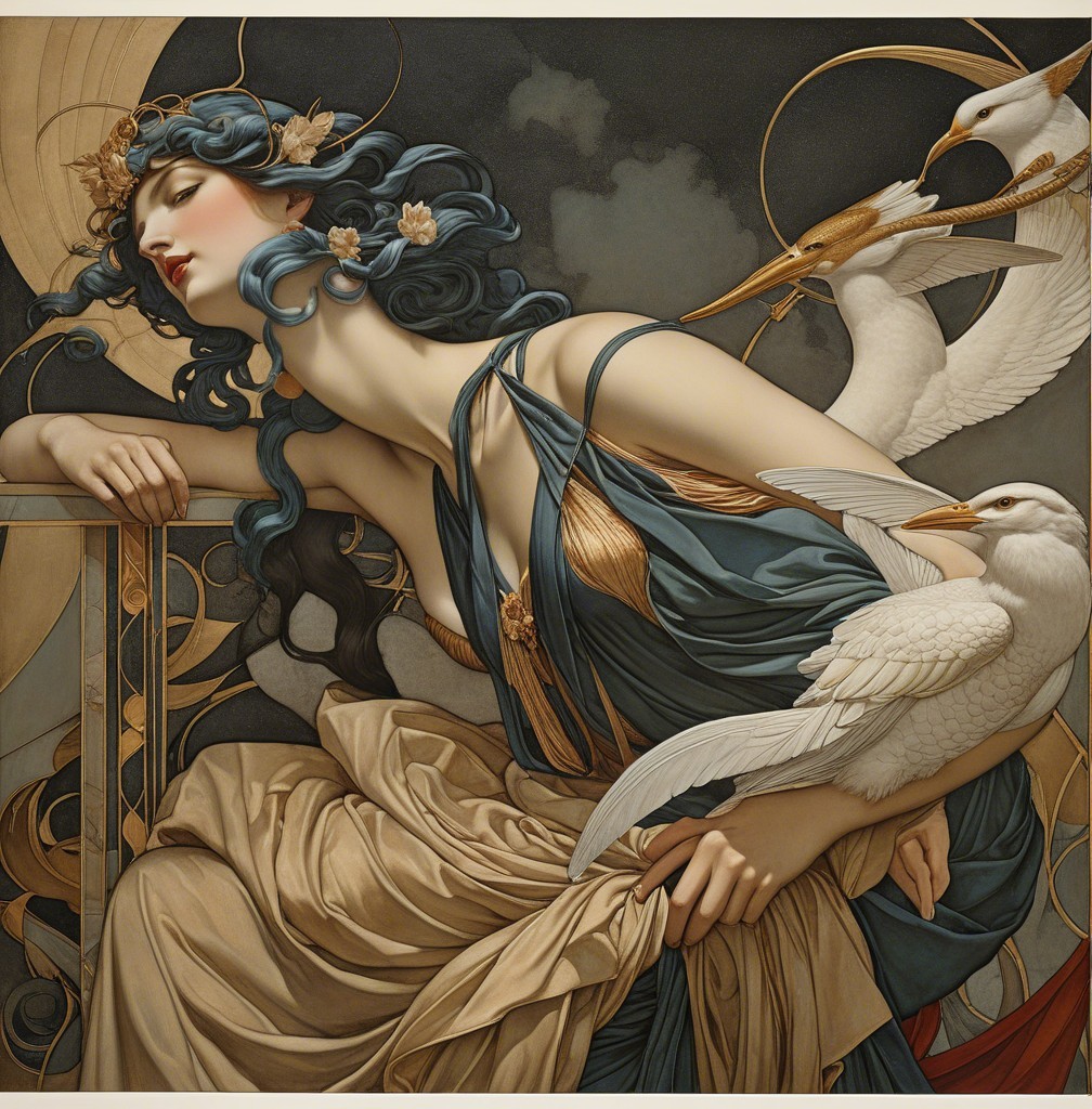 The artwork features a graceful woman draped in flowing garments, adorned with delicate jewelry. An eagle rests beside her, creating a harmonious blend of elegance and nature.