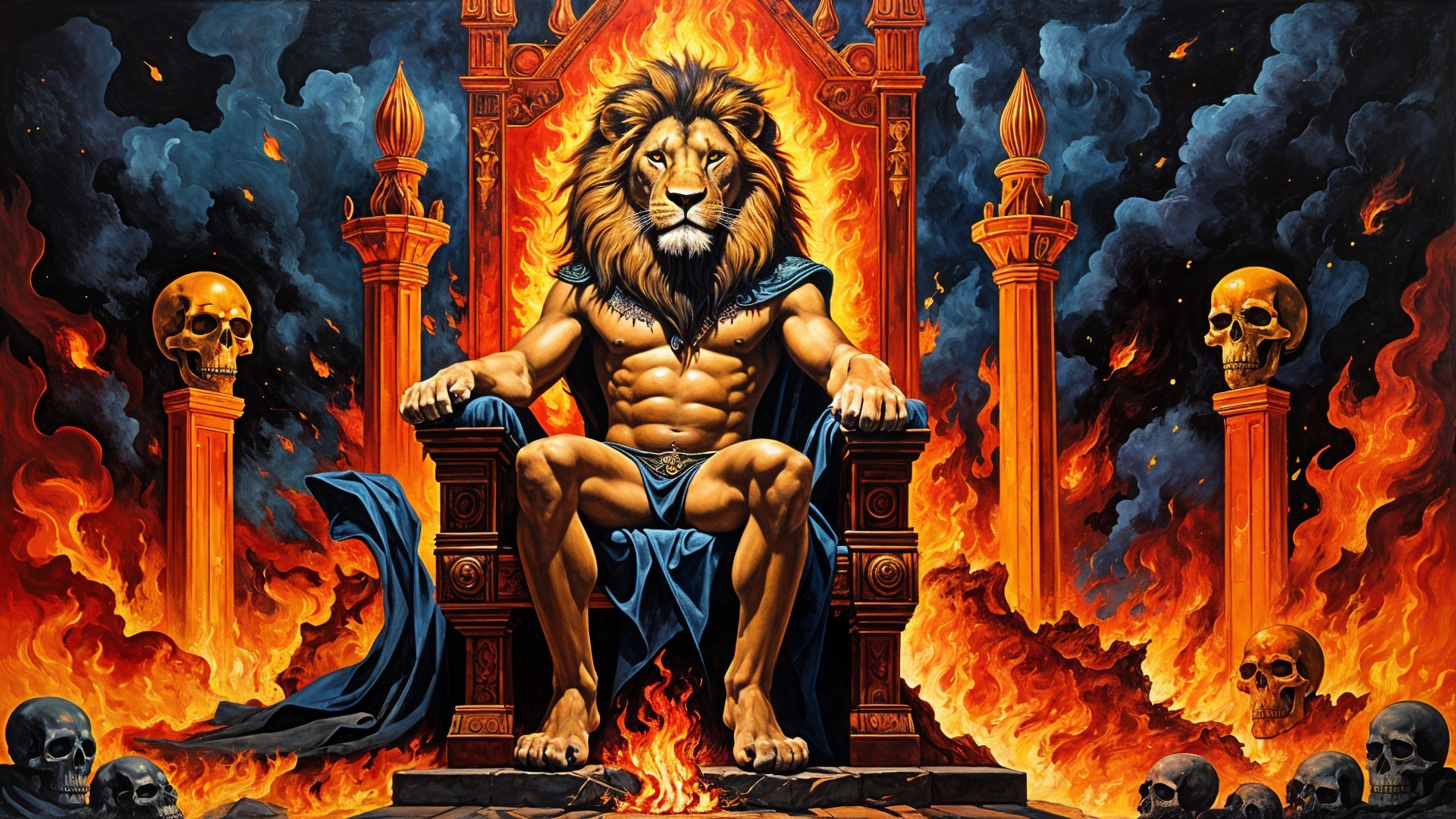 A powerful, muscular, anthropomorphic lion character with a human body and a lion's head is seated regally on a golden throne, emanating an aura of intense heat and power. The character's chiseled physique is prominently displayed, with well-defined abdominal muscles, arms, and legs