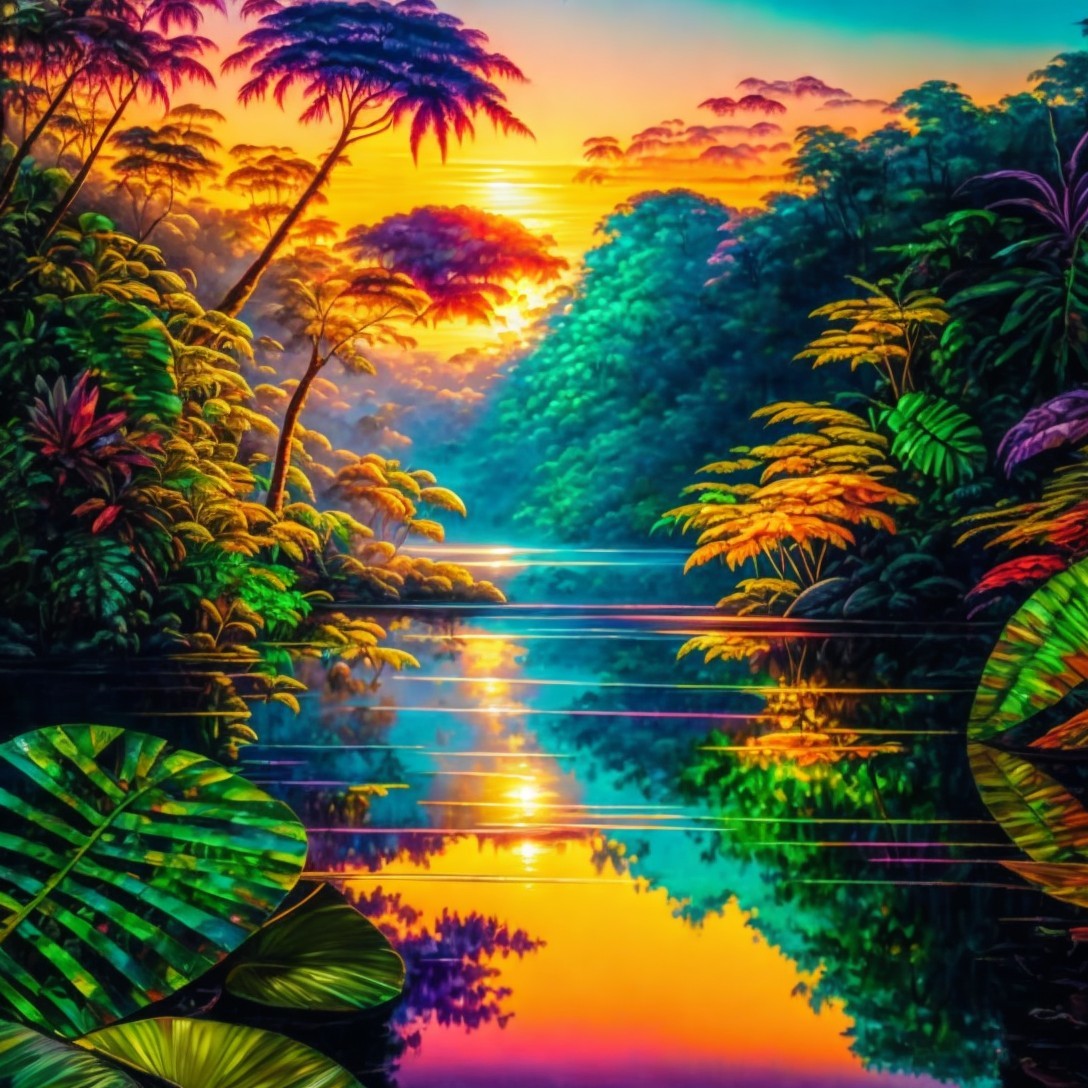 Prompt: "FULL PAGE image, no angled image, 3d patchwork, sunset by William Turner, dense Rainforest jungle, contour lighting, [foreground large plant leaves, brightly colored tropical flowers], reflections in winding river, intricate, satiny, high quality, shimmering, vibrant colors, with subtle Tingatinga style elements"