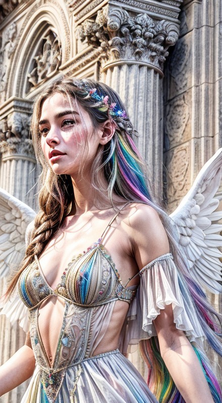 A serene young woman in a flowing blue gown, adorned with intricate details and a delicate necklace. She has long, wavy hair and gentle features, surrounded by a soft, ethereal background.