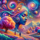 A surreal landscape with vibrant colors features a majestic figure in the sky, swirling cosmic patterns, and two travelers walking through a beautiful valley adorned with blooming trees.