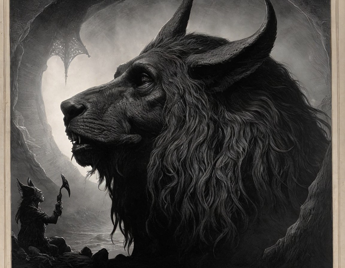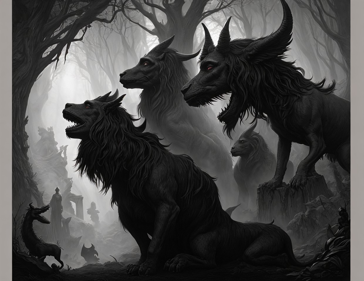 Prompt: "mysterious and deep vitality to chimeras, dreams, nightmares, intangible shapes bathed in light and shade, weirdly caricatured silhouettes and all the monsters of fantasy"