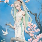 A serene figure in a flowing white garment stands among cherry blossoms, surrounded by delicate butterflies against a tranquil blue sky, exuding elegance and a sense of harmony with nature.