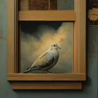 A detailed artwork of a pigeon perched on a wooden window sill, framed by lush greenery outside. The serene, vibrant landscape creates a harmonious connection between nature and home.