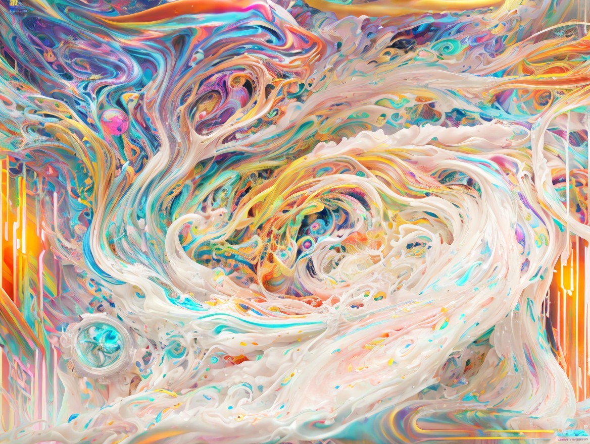 A vibrant digital artwork with swirls of iridescent colors and fluid patterns creating a mesmerizing abstract visual experience.