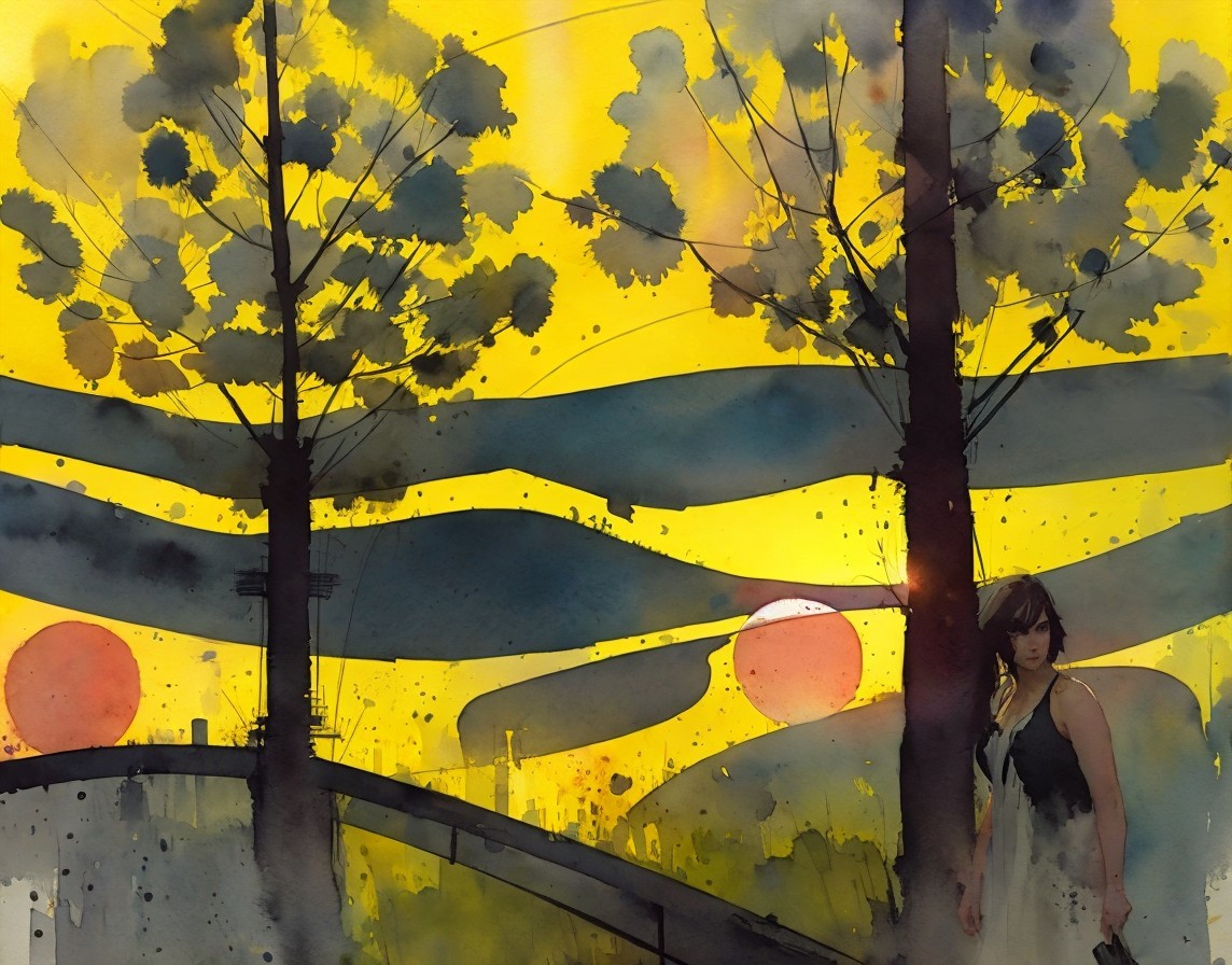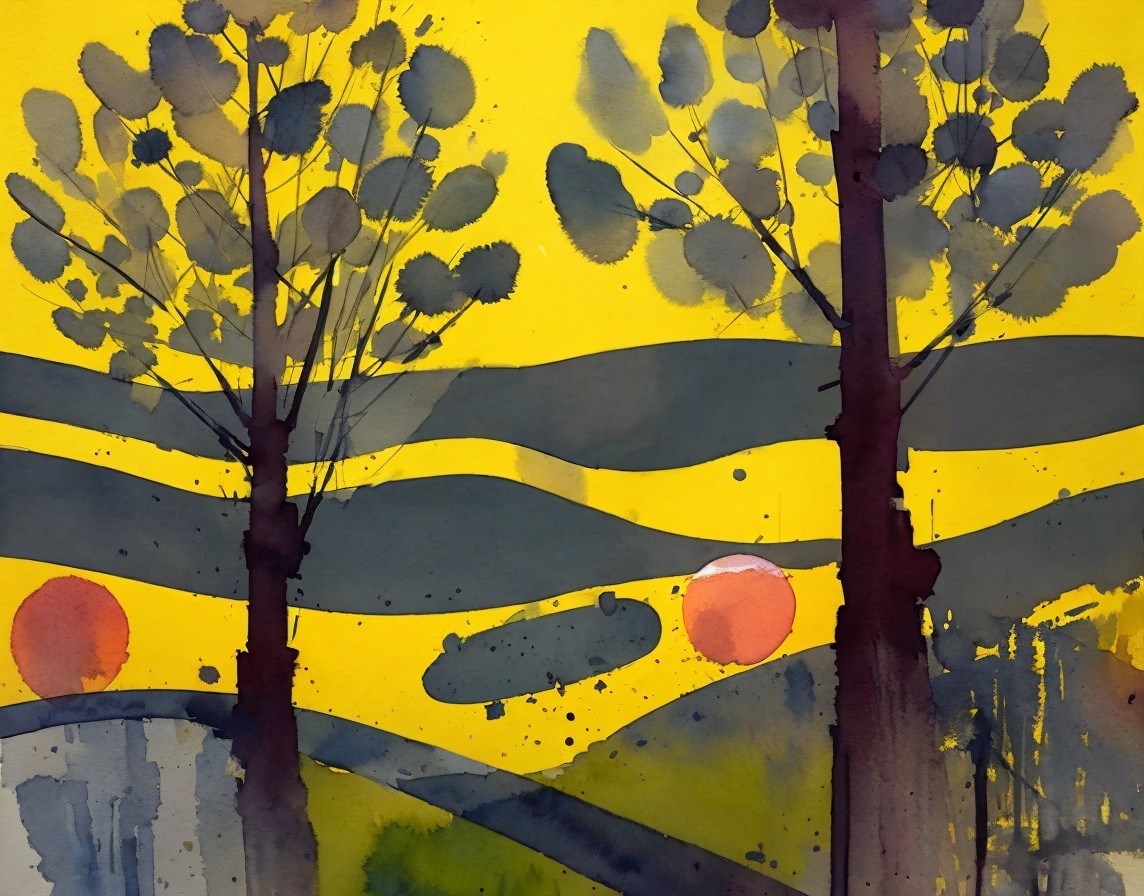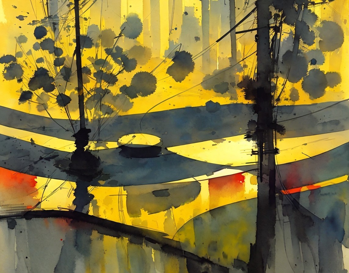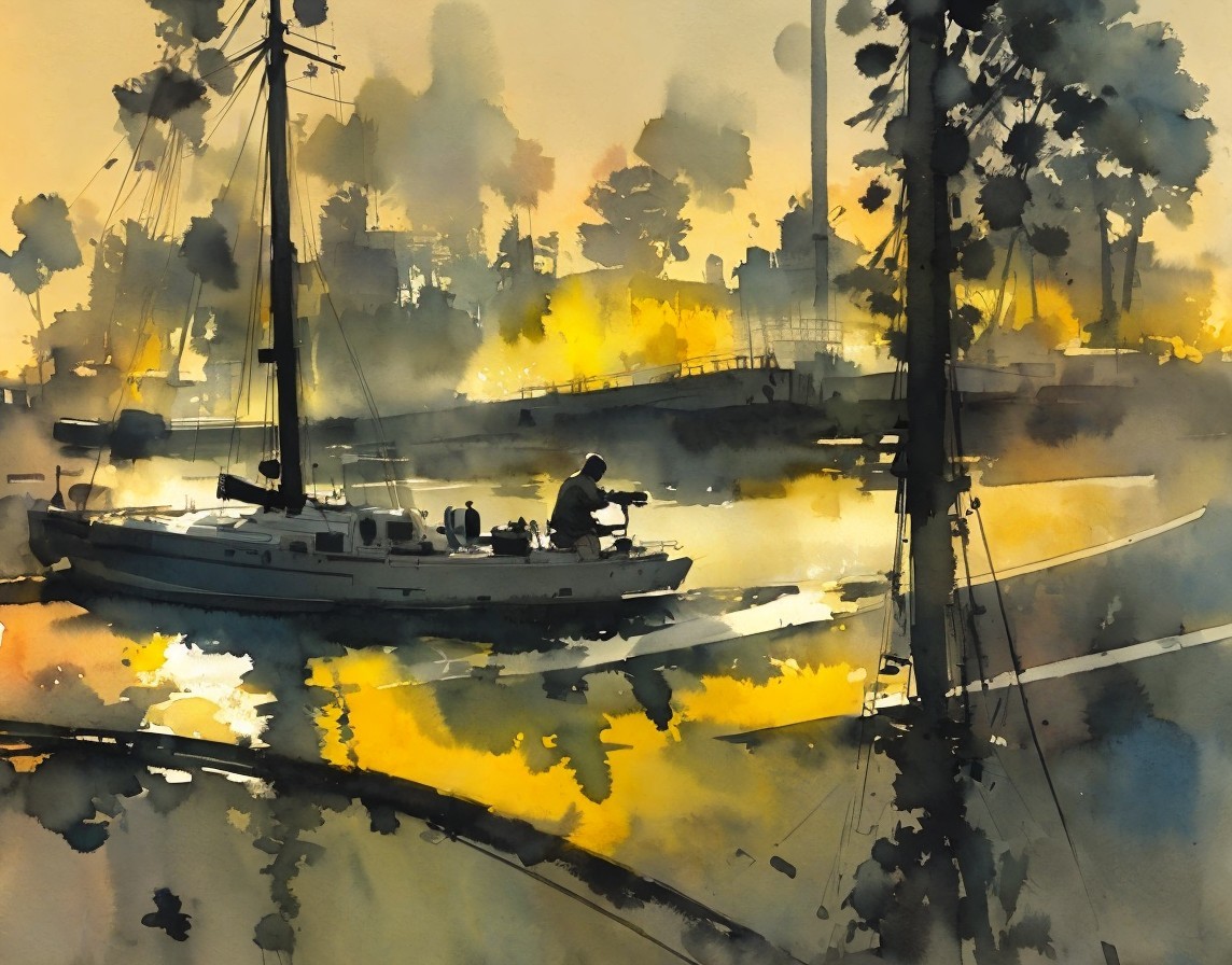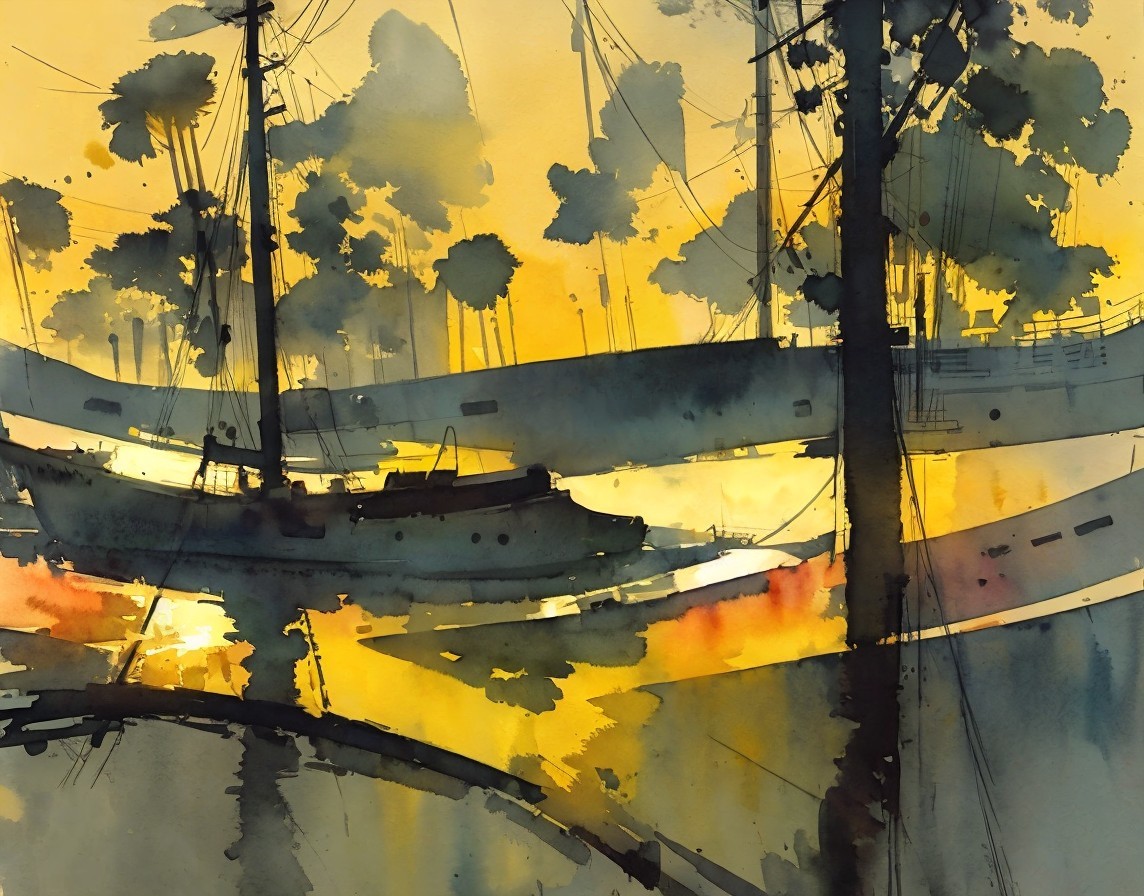 A watercolor painting of sailboats on tranquil waters with a hazy city silhouette in the warm glow of dawn or dusk.