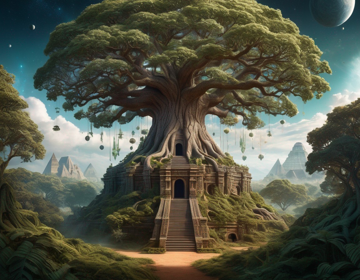 "Imagine a mesmerizing digital artwork showcasing a colossal oak tree adorned with intricate zentangle roots, crowned on a pyramid intertwined with extraterrestrial technology. Envelop the scene in ethereal light, harmonizing the earthly and alien elements. This captivating fusion invites exploration of the intersection between nature and advanced extraterrestrial influences within this surreal composition."
