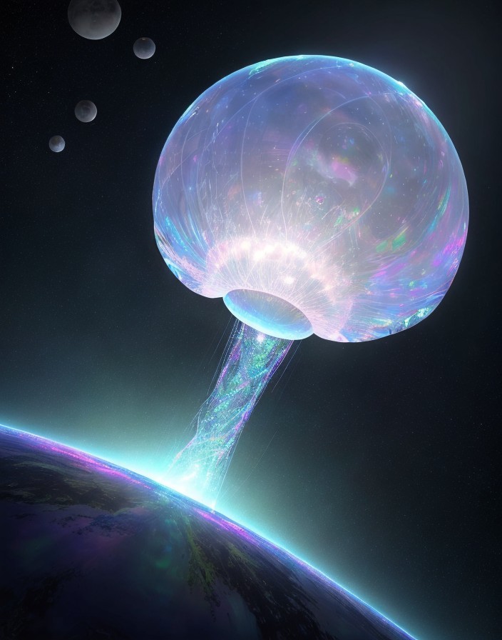 Floating in space: Large Gelatinous Alien Orb, made of jiggling mother-of-pearl, holding with gossamer iridescent silken threads other such orbs, encircling it. Extremely crisp and focused.