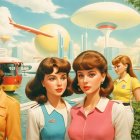 A colorful LEGO scene features five female mini-figures in stylish outfits, standing against a vibrant city skyline with palm trees and airplanes, creating a playful and lively atmosphere.
