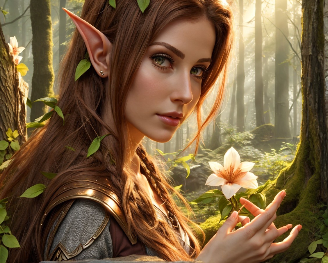Elf with Pointy Ears Holding White Flower in Forest with Sunlight