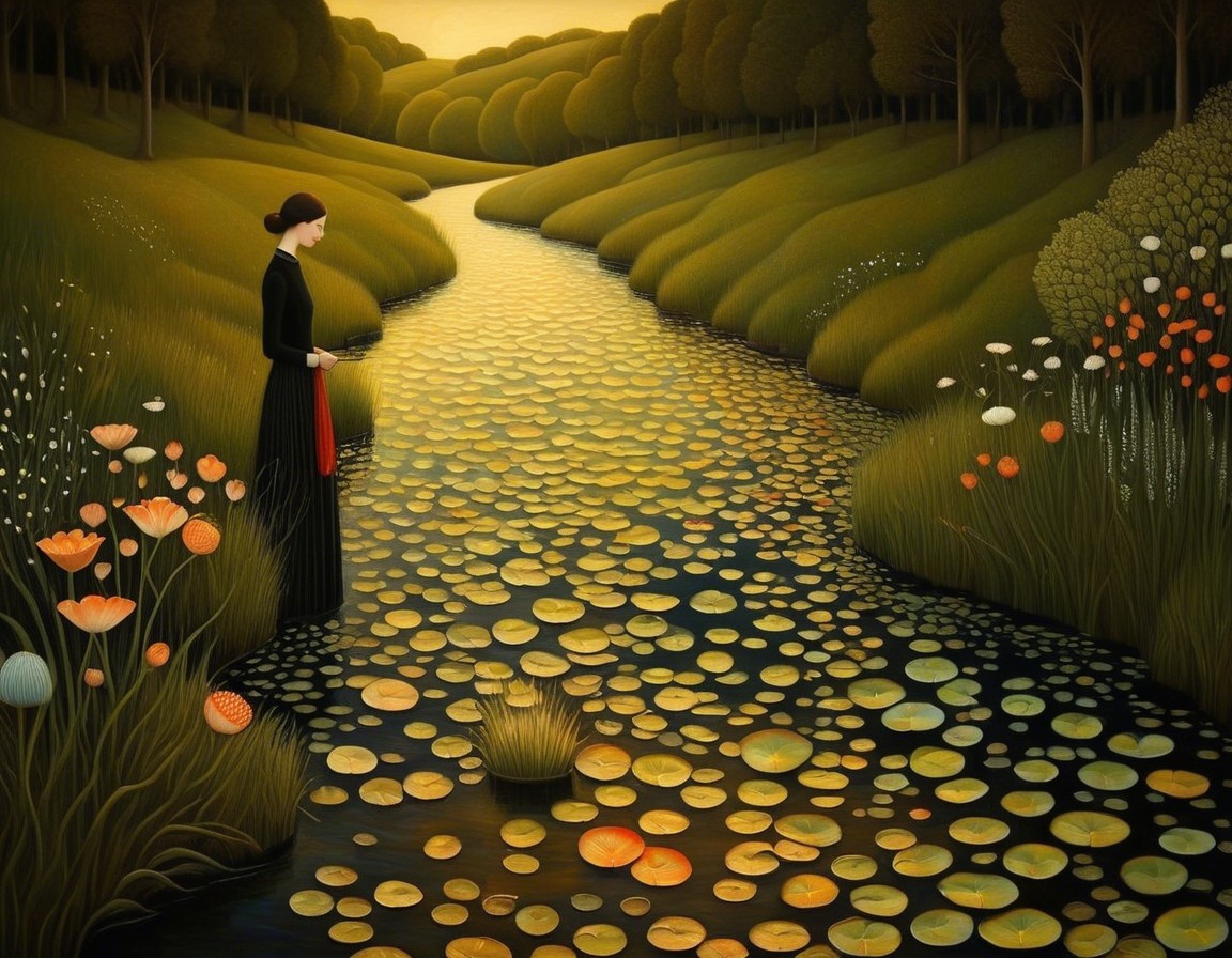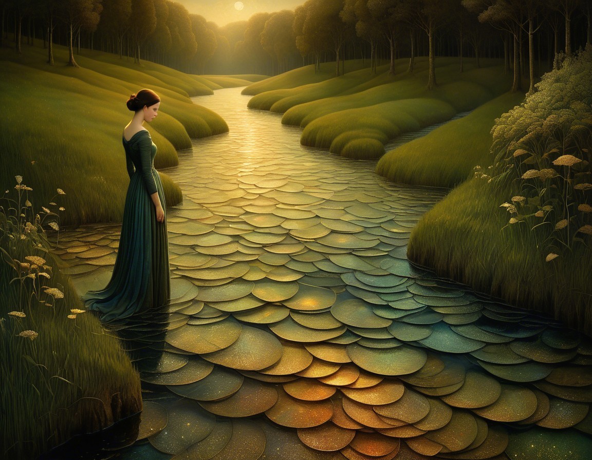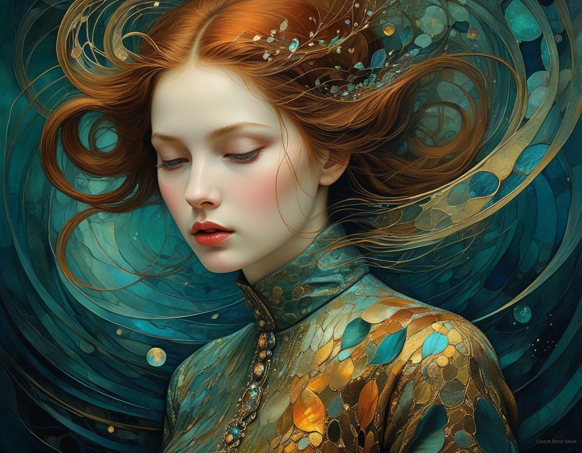 A stunning portrait of a woman with flowing, vibrant hair surrounded by swirling colors and intricate patterns. Her expressive eyes and elegant features convey a sense of beauty and mystique.
