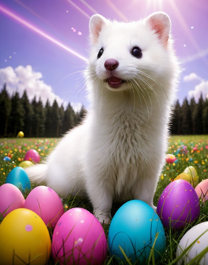 Prompt: "Fluffy ferret frolicking in meadow, basket of colorful Easter eggs, blooming flowers backdrop, playful moment, lens flare effects, vibrant colors, hyperrealistic details, 8k resolution. Blend Junji Ito's horror, Robert Oxley's mastery, Gazelli's uncanny touch, M.W. Kaluta's surrealism. Mixed brush strokes, paint splatter, drip painting, masterpiece, ArtStation trend. Nikon Z9, 85mm F1.2 lens, intricate details, high-resolution, photorealistic quality."