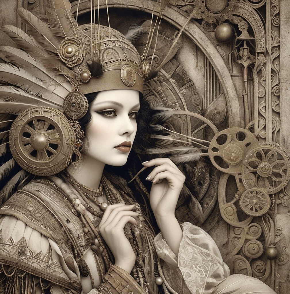 A striking portrait of a woman in traditional attire, adorned with feathers and intricate jewelry. Her elegant pose reflects cultural depth against a textured, ornate backdrop.