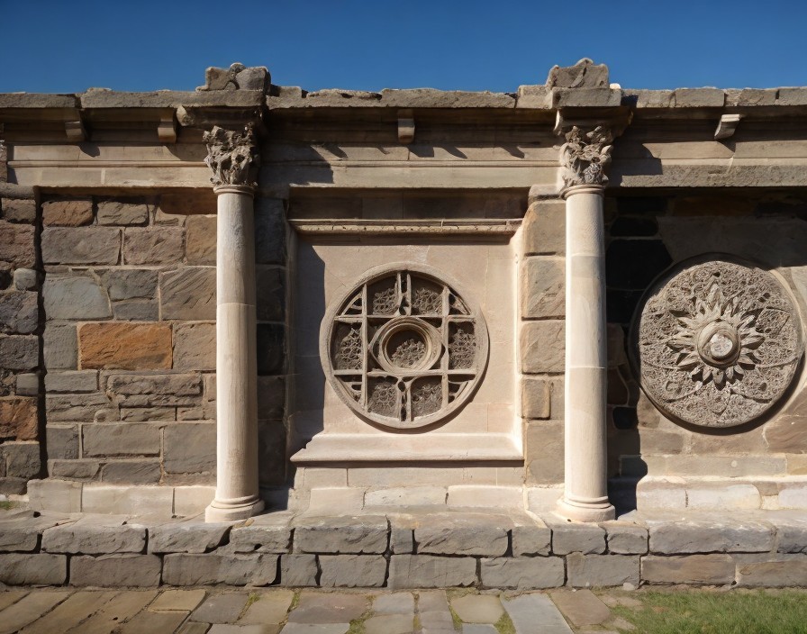 Ornate circular floral relief pattern on stone wall under clear blue sky