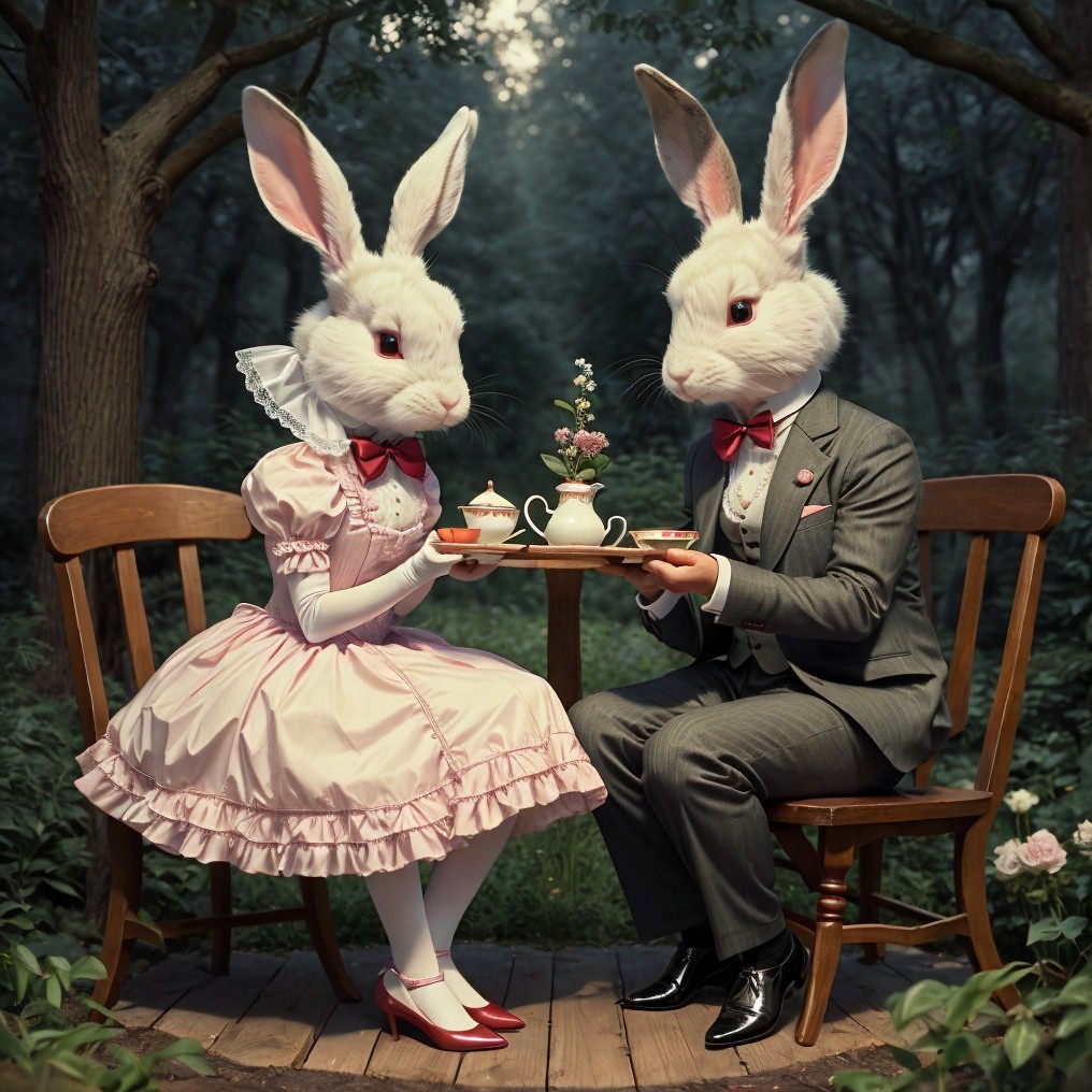 + Prompt:Two anthropomorphic rabbits dressed in elegant Victorian attire, having tea in an enchanted forest setting at dusk. The female rabbit is wearing a frilly pink and white dress with a lace collar and a bow on her head, while the male rabbit is dressed in a smart green suit with a red bow tie and pinstripe trousers. They are sitting on wooden chairs at a small round table with a classic porcelain teapot and teacups. Surrounding them are lush trees with magical lighting, creating a whimsical atmosphere.