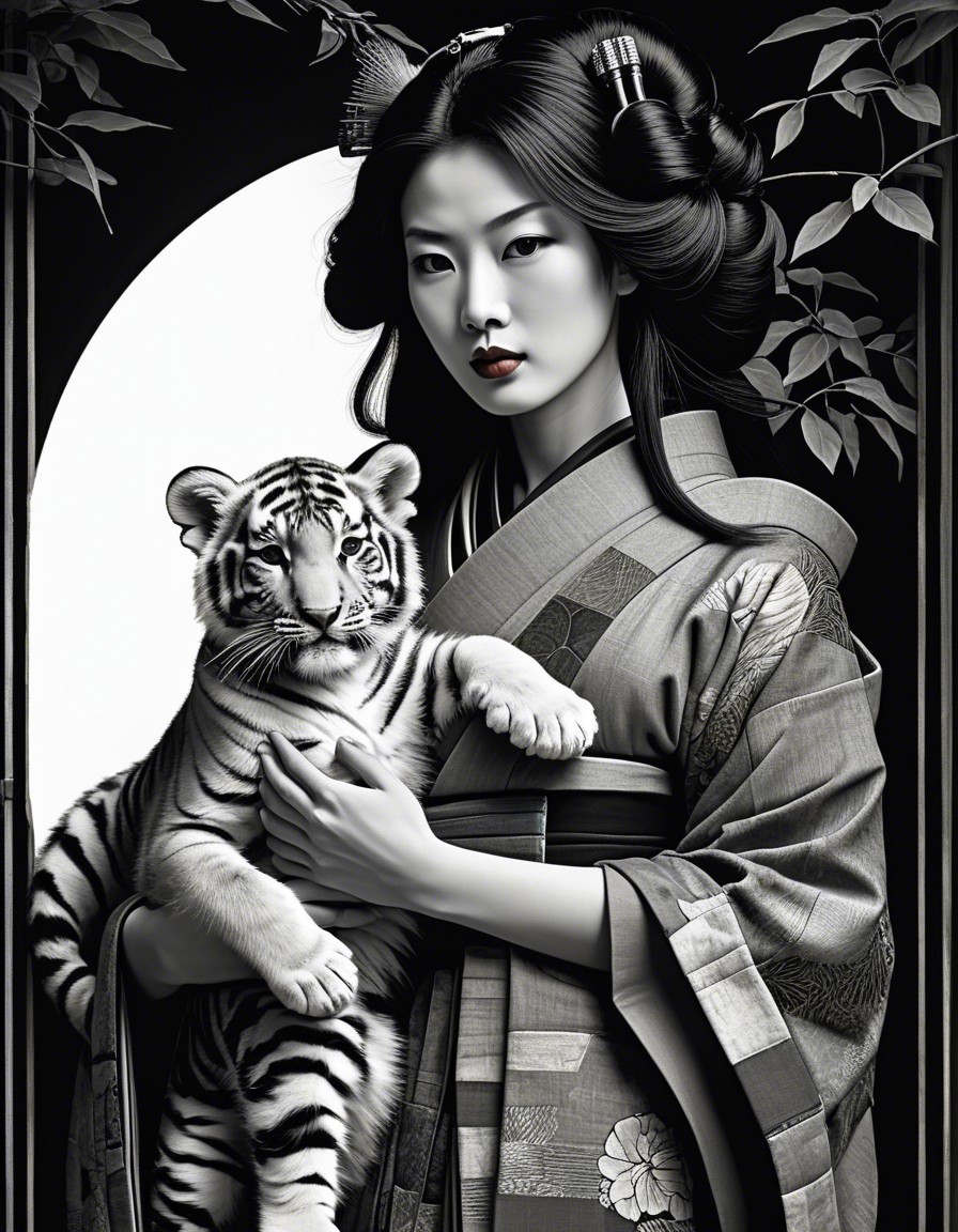 A monochrome portrait of a woman in traditional attire holding a tiger cub, framed by an arch with bamboo.