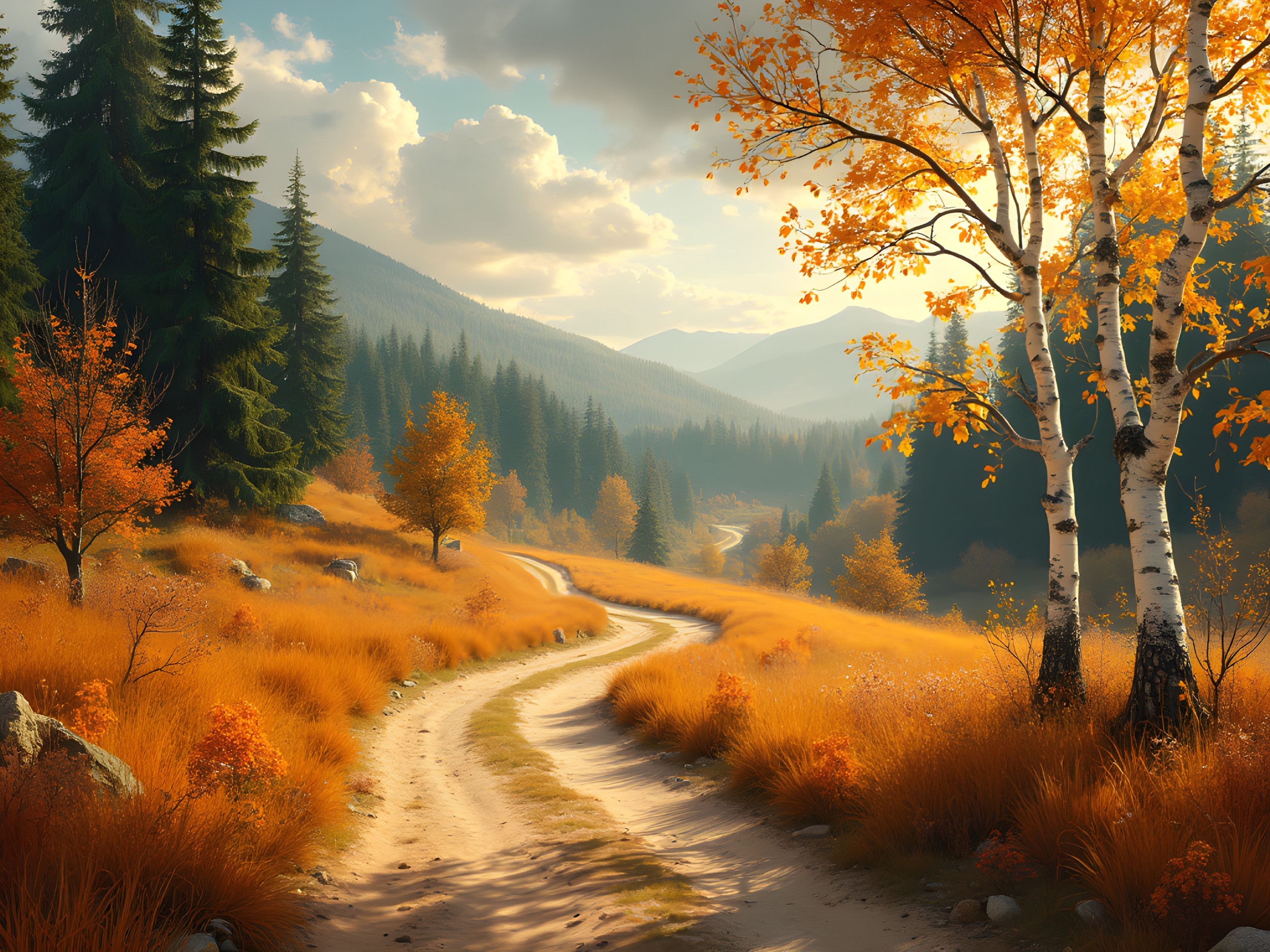 A serene autumn landscape features a winding dirt path flanked by vibrant orange and yellow foliage. Tall evergreens rise in the background, illuminated by soft, golden sunlight.