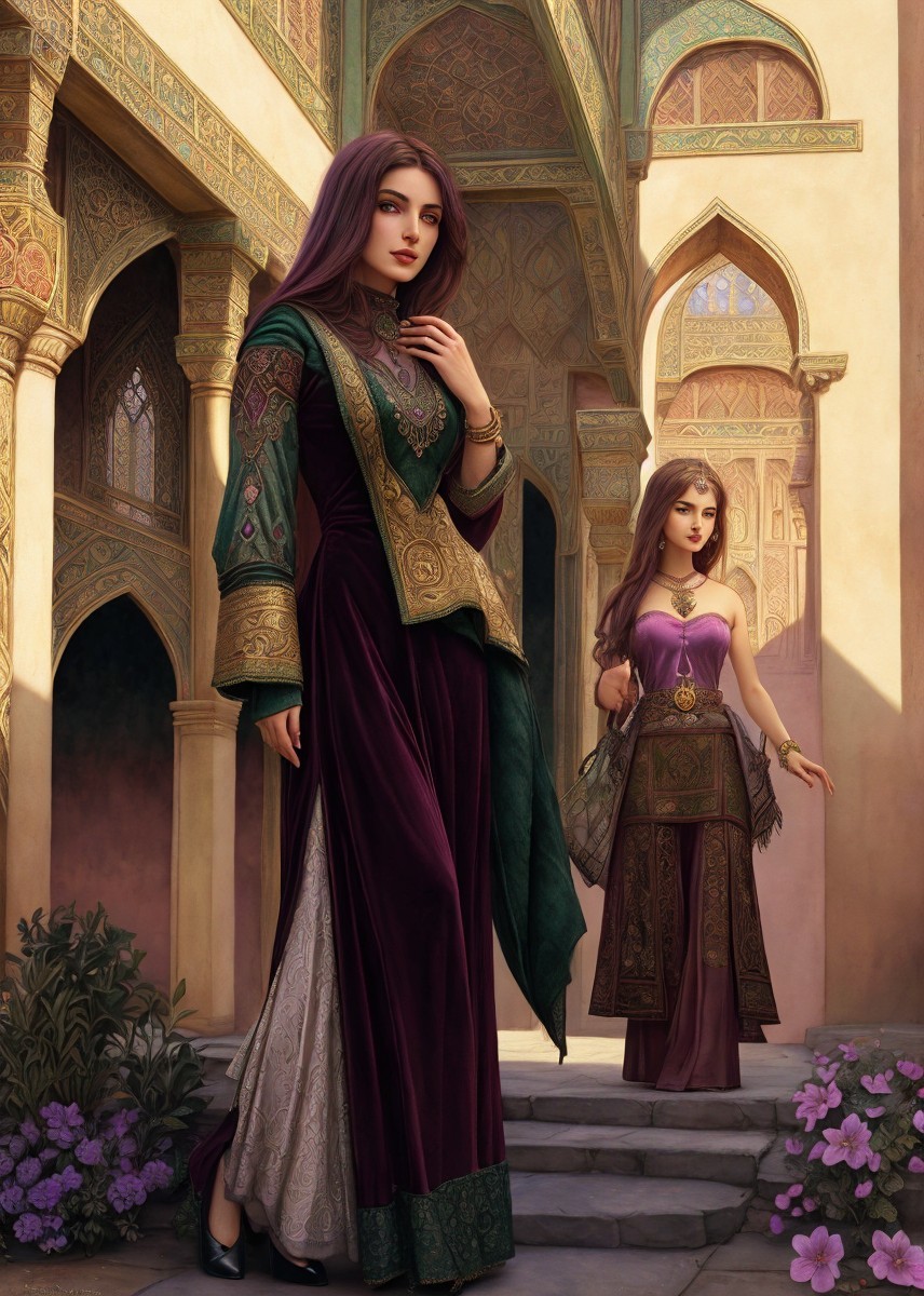 Digital Artwork of Women in Traditional Dresses in Courtyard
