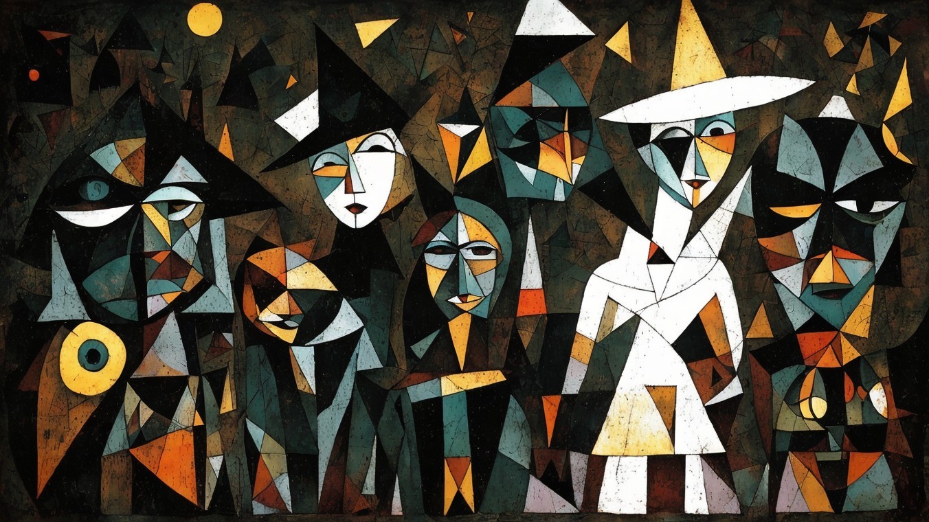 An AI artwork with a dark background displays five anthropomorphic witches in an avant-garde cubist art style. The figures are composed of geometric shapes in black, white, gold, dark silver, light gray, and brown. Starting from the left, a witch with a black pointed hat, a gray