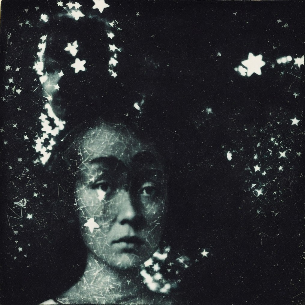 A dreamy portrait of a young woman surrounded by a starry backdrop, capturing a whimsical, ethereal atmosphere with soft lighting and a vintage aesthetic.