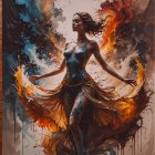 A dancer poses gracefully against a vibrant abstract backdrop, featuring splashes of blue, orange, and gold. Her elegant dress flows with movement, embodying artistry and expression.