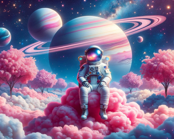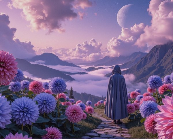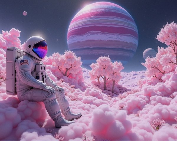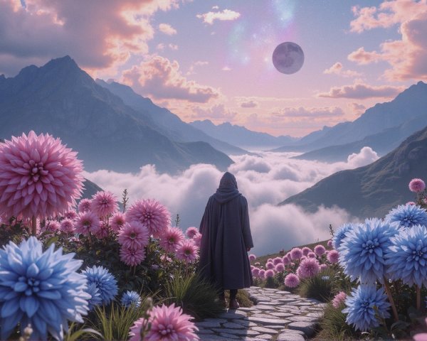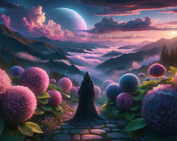 A surreal landscape features two intertwining, circular portals leading to vibrant mountains and a dramatic sky, set against a cosmic backdrop, evoking a sense of adventure and infinity.