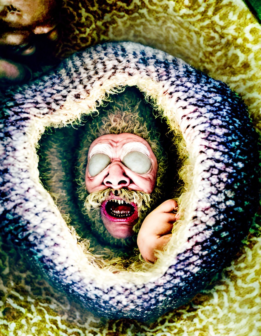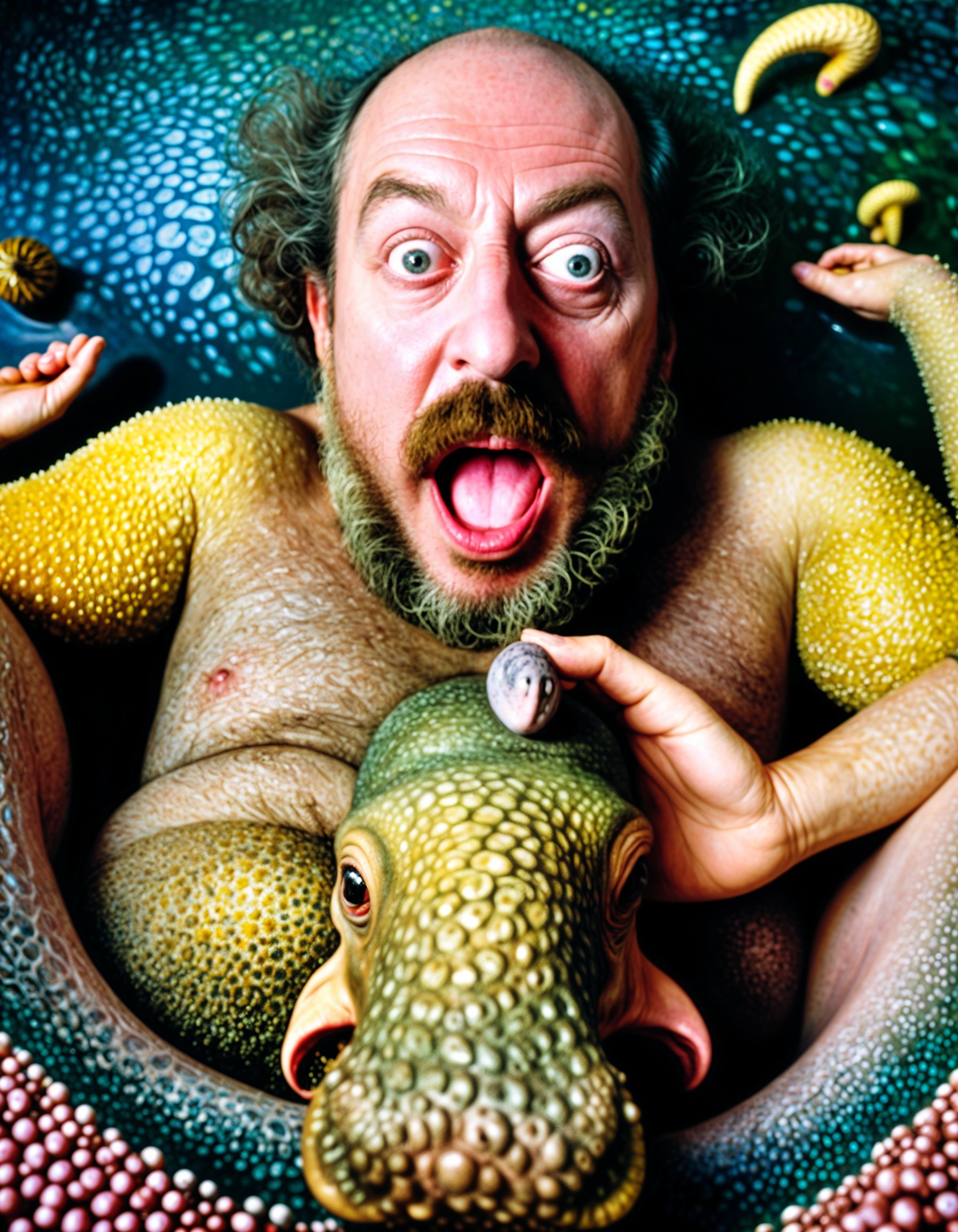 A surreal composition featuring a man surrounded by colorful, exaggerated animals like elephants and fantastical creatures, evoking a whimsical and dreamlike atmosphere.