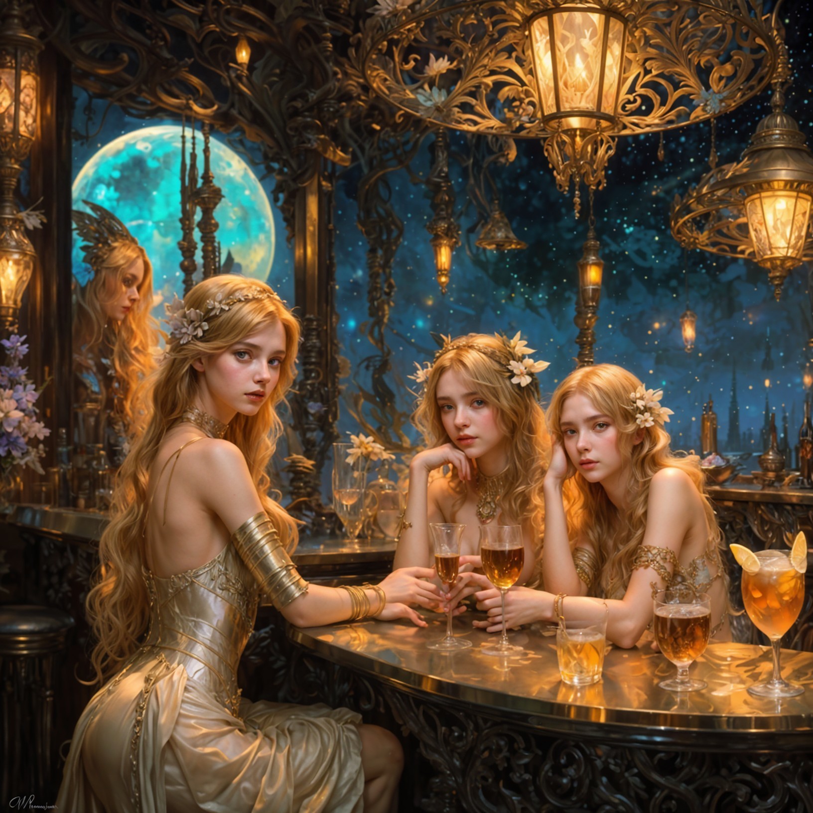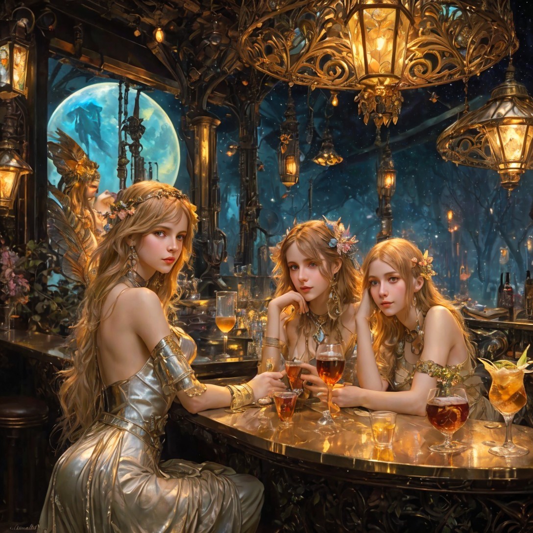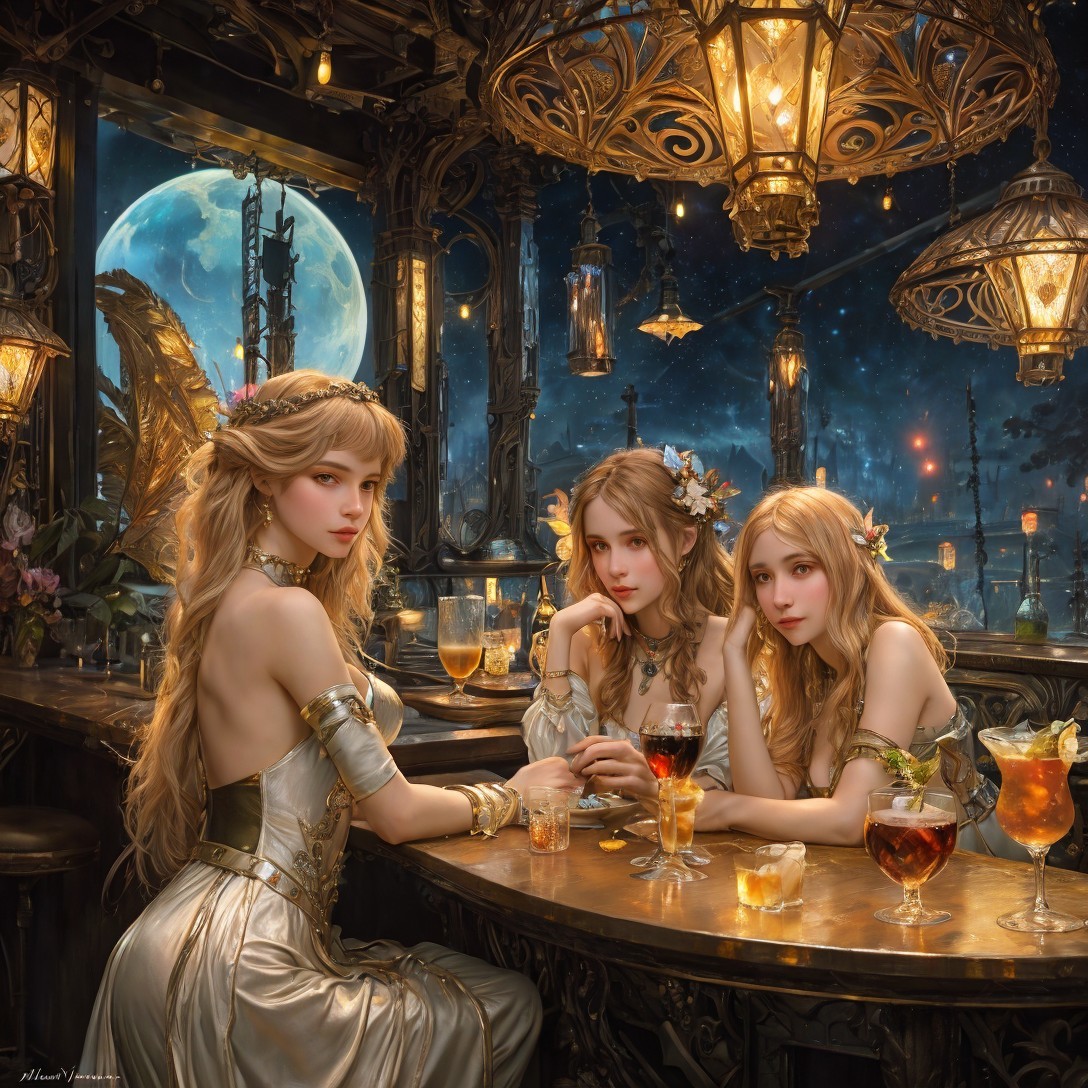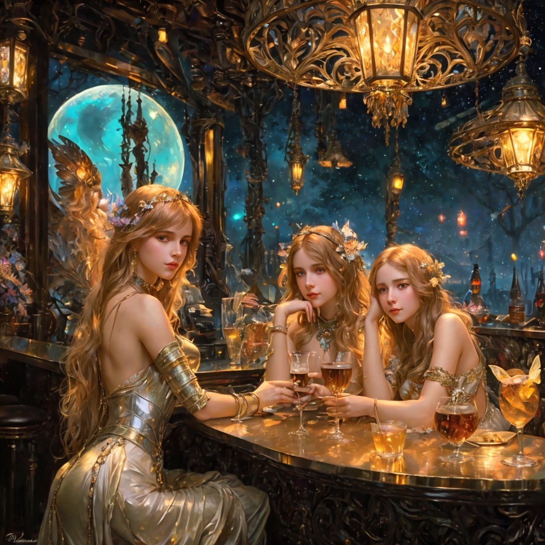 + Prompt:(masterpiece, best quality, ultra-detailed, 8k:1.2), acrylic art, by Victor Vasnetsov style, by Mikhail Vrubel style, Science fiction, hard sci-fi,Three fairies beings sit together at a dimly lit bar, sipping drinks and sharing an air of intrigue and mystery, surrounded by a vintage, atmospheric setting, fantasy style, beautiful blonde, very drunk, (((sensuality))), enhanced beauty, hypertrophied femininity, cocktail, hypper-realism,(ECXELLENT LEGS), FULL BODY PORTRAIT, forbidden reality against the backdrop of a futuristic city, acrylic art, by Victor Vasnetsov style, by Mikhail Vrubel style,