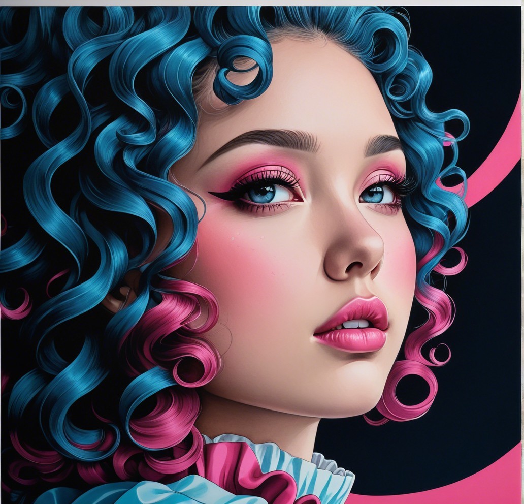 Prompt: Masterpiece anime illustration merged with an advertising poster concept, intricate ink and pastel drawing technique, featuring a woman with curly tesselated hair. Encoustic curls in baby-blue and dark pink. Dyed tesselated hairdo. Glossy, plushy, opulent artwork is reminiscent of Mokuhanga art, set against a dark background in a captivating close-up composition. The style draws inspiration from the surreal flair of Ho Baron and the detailed linework of John Buscema. The color palette, rich in hues curated by Mike Kaluta, is brought to life with meticulous coloring by Stan Lee. This unique piece embodies a fusion of artistic influences, harmoniously crafted in a style akin to the masterful touch of Frank Cho, --ar 1:1 --q 2 --s 750, brightened color palette, multi-layered eyes, stylized hairdo, post-avantgarde style, fine-line illustration, gradient inking, raytraced shadows, 3D effects, movie still, subsurface scattering 1.3, vintage aesthetic, warm tones, coarse texture, triadic color scheme dark-red baby-blue light-auburn, dof, debeh, bokeh, layered, back-lit, color glitch, brightness 1.3, shadow mapping 1.8, radiance, hypermaximalism, subsurface scattering, stylization. Plasticity 1.3, parallax occlusion 1.2, ambient occlusion by Ho baron, fusion art concept, precise Gelsculpt 64K, stylized, chipped, warm pastel color palette, simplistic headshot, intricate ambient occlusion 1.3, raytraced shadows 1.3, dynamic lighting 1.7, lighting by Ed Paschke, sculpted, flowing hair illusion, ethereal atmosphere, layers of fabric evoke a sense of calmness and harmony, plasticity 1.6, dynamic lighting effects, indiecore details, smirky smile, delicate paper fibers and subtle paint cracks,
