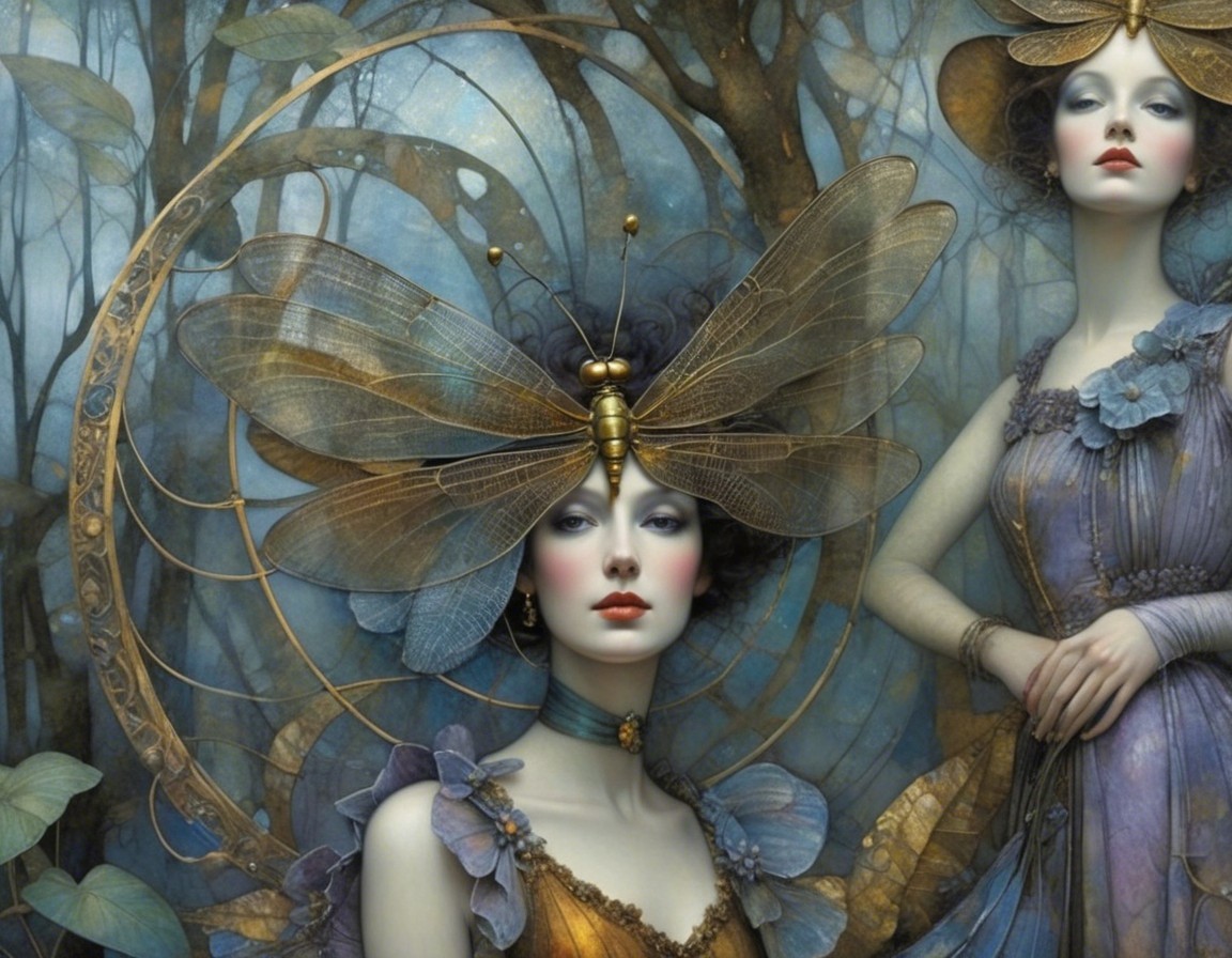 Dragonfly Surreal dream in the style of Alexander Jansson and Rolf Lindberg, nostalgia, glory, Mercury Glass patina, light and gossamer haze, topographic lines, Art Brut, moody, somber, desaturated colors. In the style of John Rogers cox . This artwork amalgamates the artistic styles of Michael Parkes,