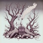 A surreal winter landscape features a twisted tree with hanging chains, overlooking a gothic-style castle and a small wooden house, all set against a dramatic sky.