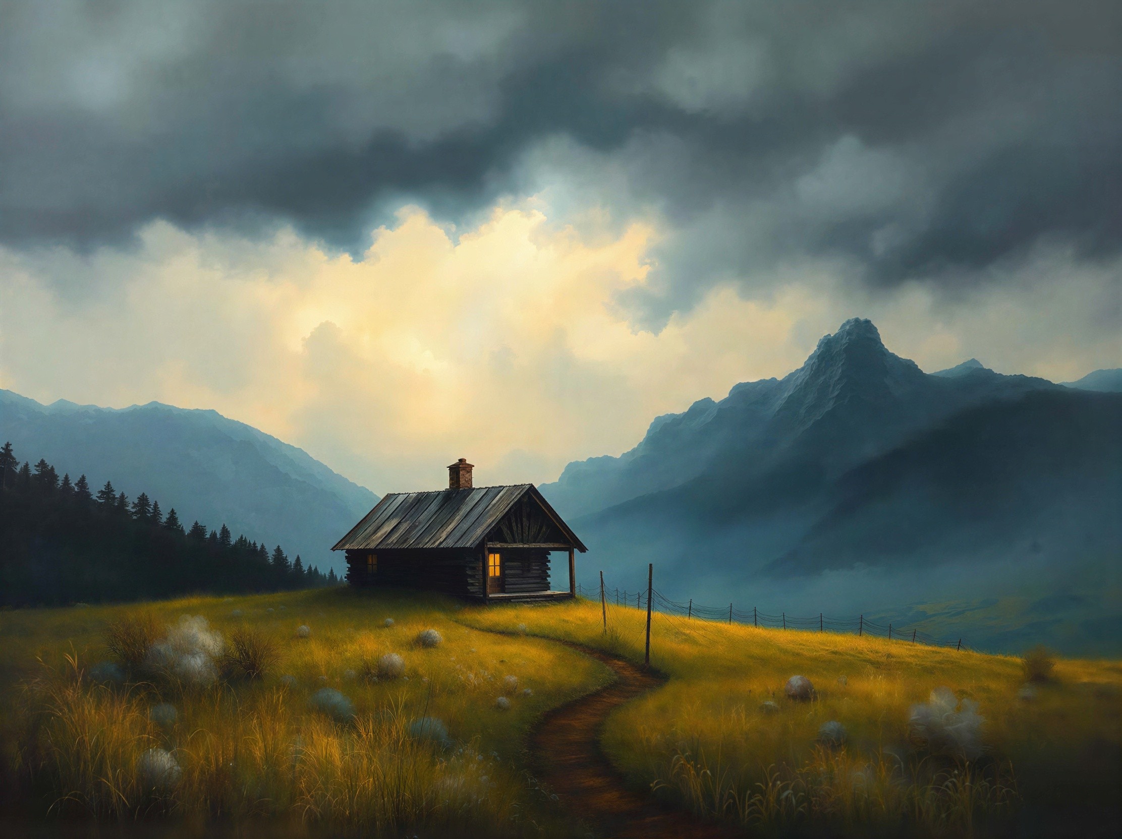 A captivating oil painting features a fading edge, depicting mountains and countryside. An old cabin glows warmly amidst dark clouds, evoking a sense of mystery and the passage of time after rain.