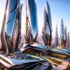 A futuristic cityscape showcases sleek, organic skyscrapers with reflective surfaces. The structures resemble elegant, flowing forms, surrounded by water and lush greenery under a vibrant sky.