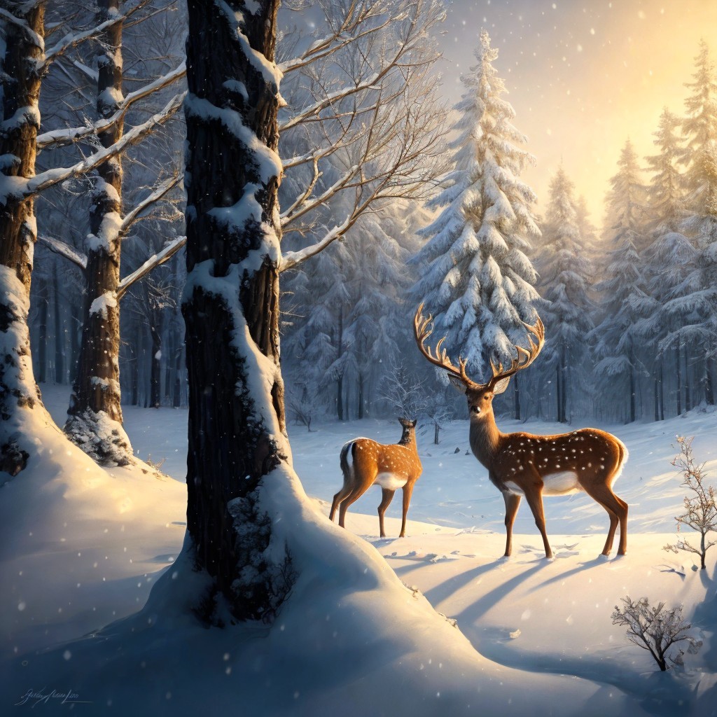 Beautiful deer in the snow in winter, crescent, bare trees, snowy hills highly detailed intricate very attractive dynamic lighting award winning hdr cinematic postprocessing Jacek Yerka acrylic art pencil sketch Yossi Kotler Dee Nickerson Gian Lorenzo Bernini