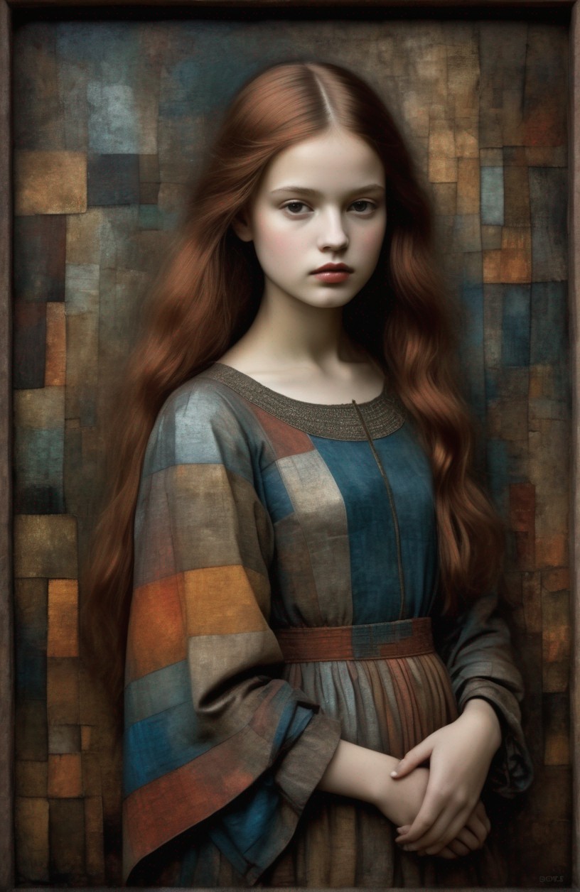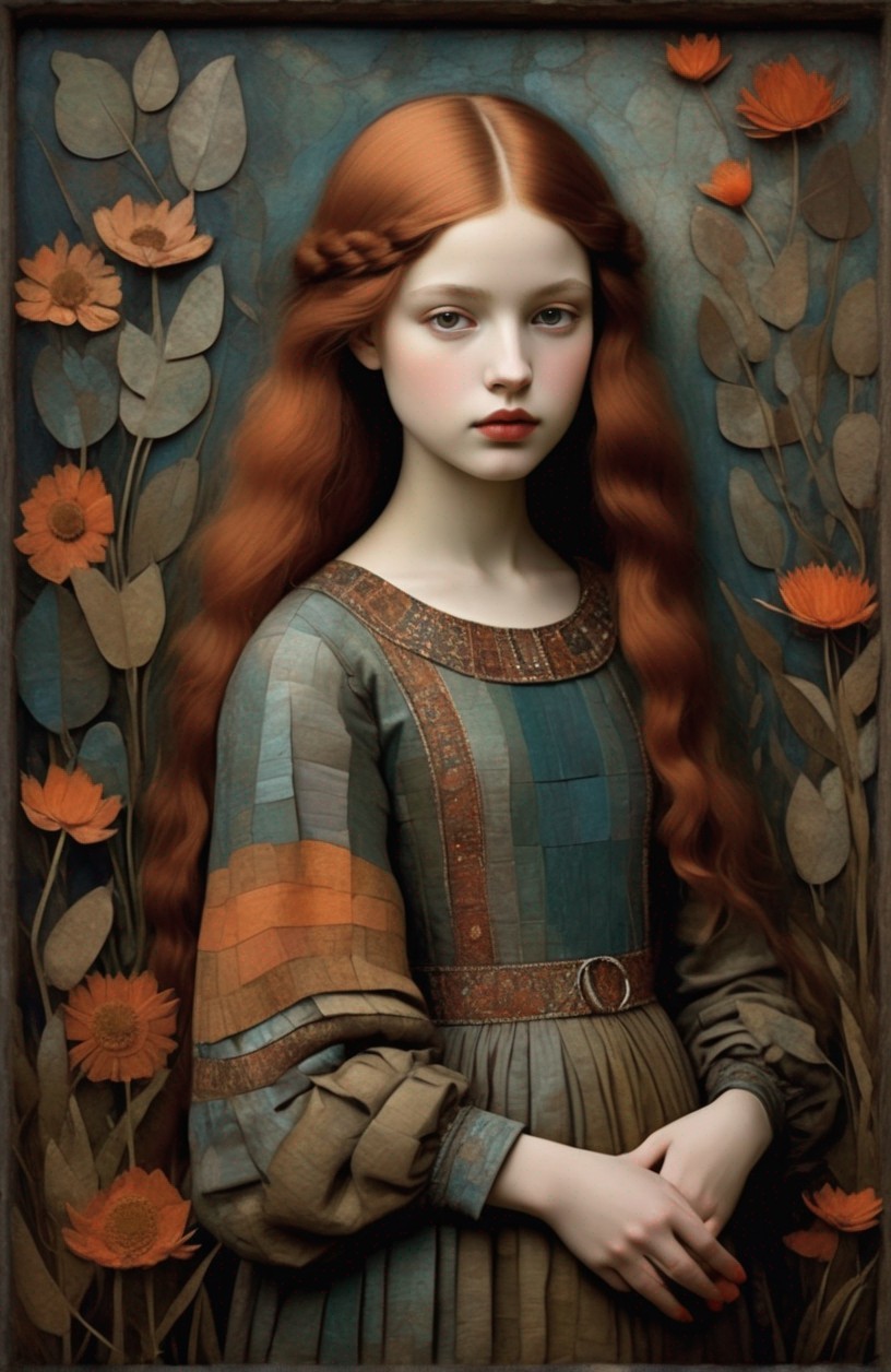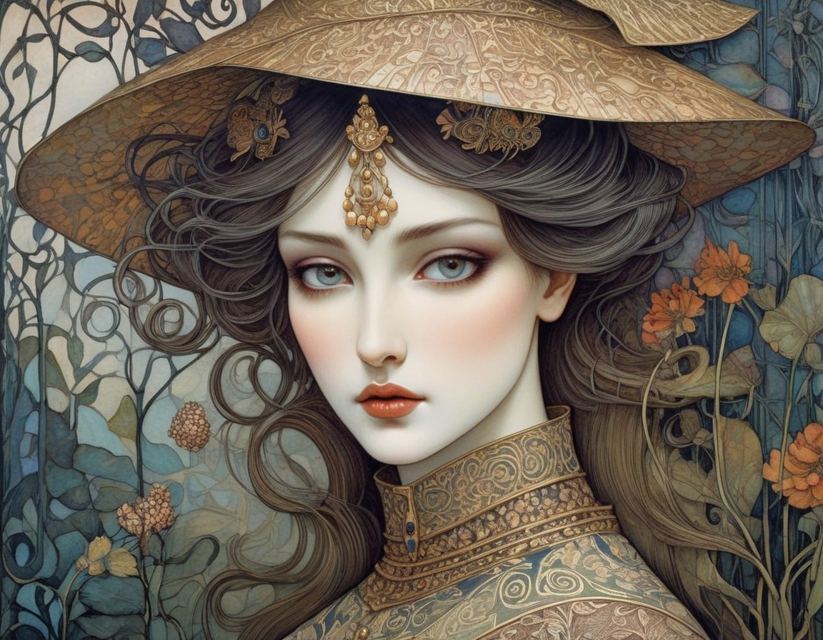 Young woman with large eyes and ornate helmet in nature-themed illustration