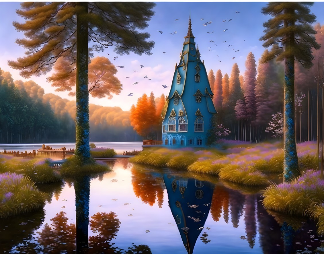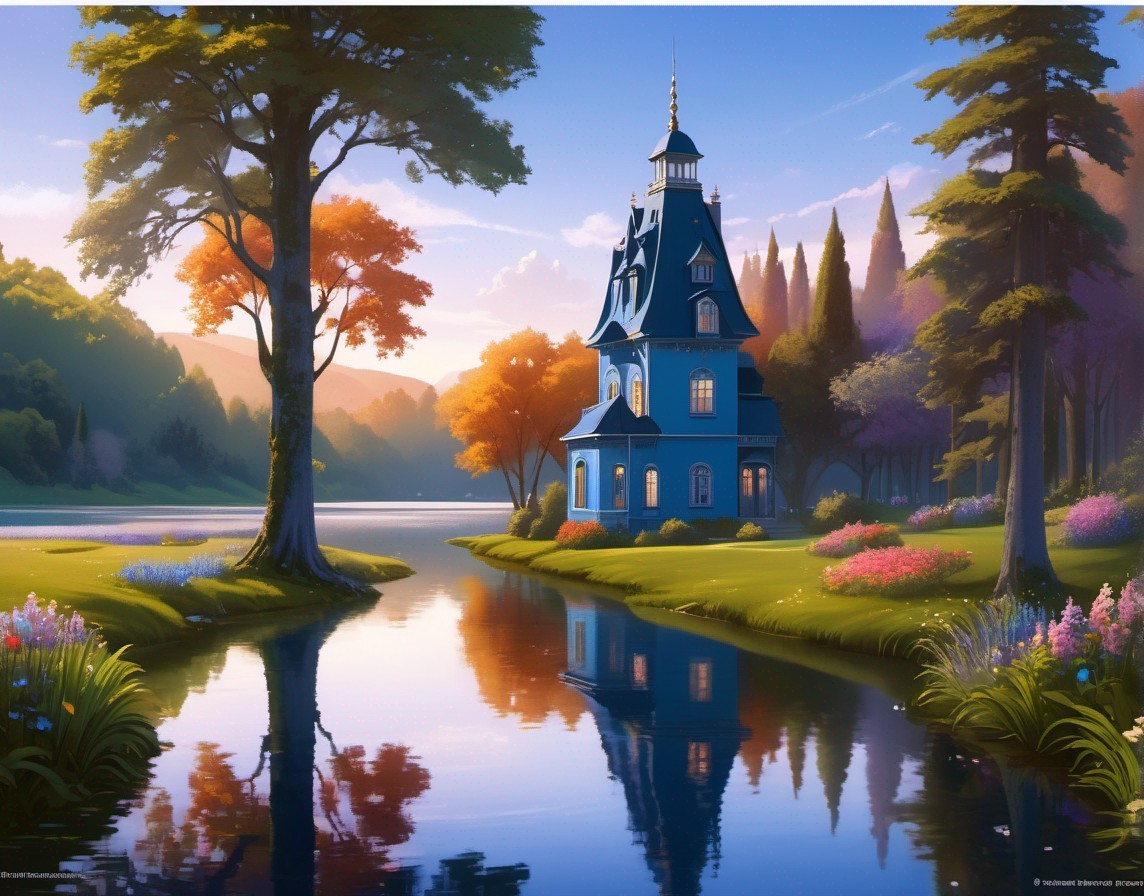 A picturesque blue Victorian house beside a calm lake, surrounded by vibrant trees and flowers in a serene, fairytale-like setting.