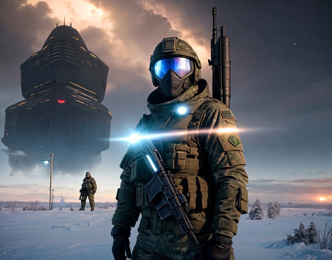 Prompt: "Soldier of future as massive man in eco suit with futuristic assault rifle on post apocalyptic background in winter Siberia, gigantic space ship in the sky far above"